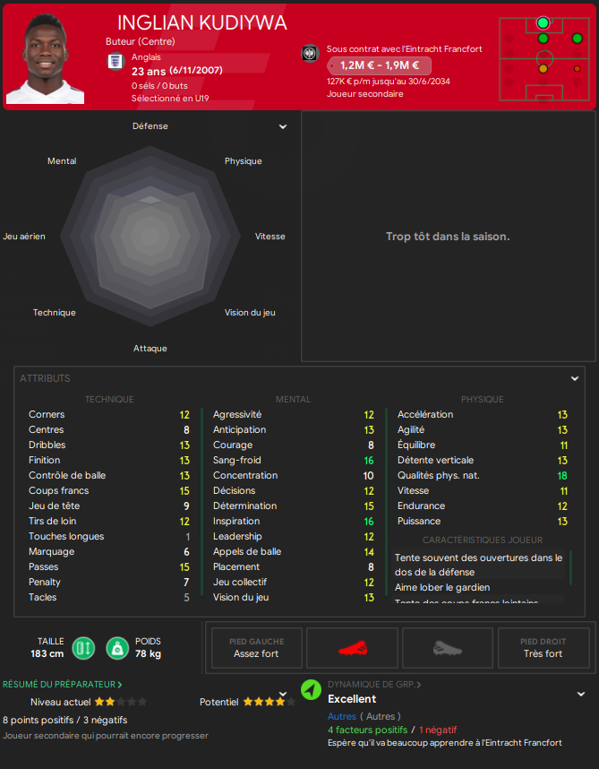 Fiche et potentiel Ă©trange vu son Ăąge mais curieux de voir sâil va exploser ou bien stagner et devenir un joueur lambda.