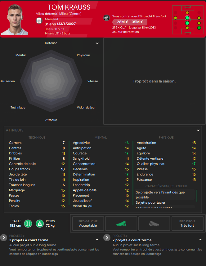 Arrivant en fin de contrat et nâentrant toujours pas dans les plans de son club formateur, câest Ă Francfort quâil continuera sa formation avec un rĂŽle annexe mais il est toujours bon dâavoir ce genre de profil dans un groupe, et en plus il semble ambidextre.