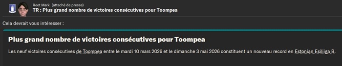 Tabasalu va sûrement le regretter dans la lutte pour la promotion en D2 alors que de mon côté je compte sur lui pour valider mon titre le plus rapidement possible.