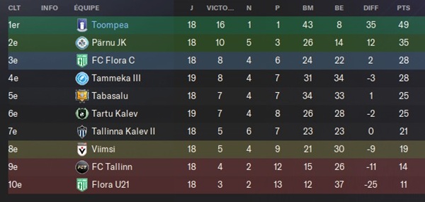 @Sythax : Ces clubs ne peuvent pas être dans la même division que Flora mais pas de soucis entre eux. Il y a énormément d’équipe B, U19, U21 en Estonie. La saison passée il y a eu un barrage pour la montée entre une équipe U19 et U21 d’un même club