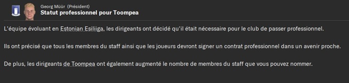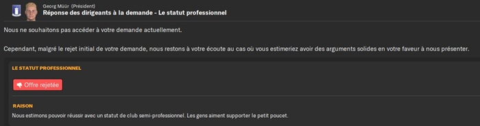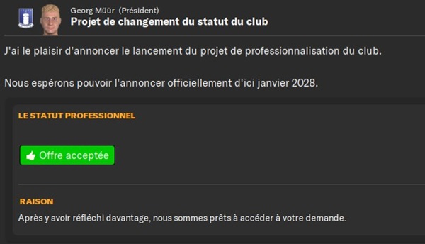 Les finances Ă©tant toujours dans le vert et la montĂ©e en D2 Ă©tant actĂ©e jâai demandĂ© un passage en pro !