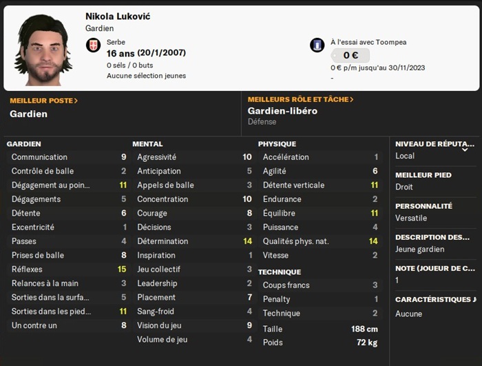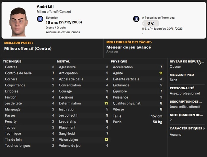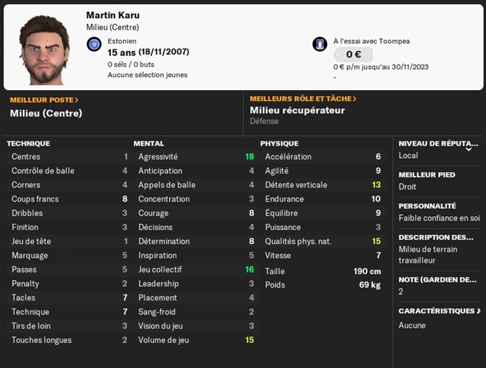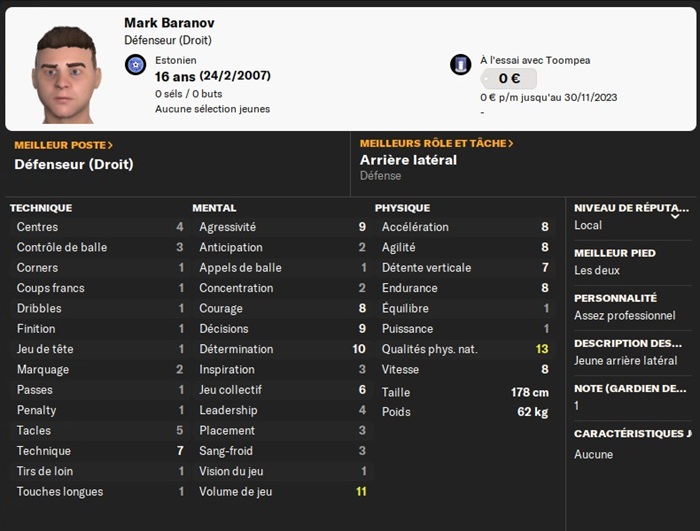 Ce petit poids plume a intĂ©rĂȘt Ă boire encore quelques soupes pour remporter des duels physiques ! Il a quelques stats intĂ©ressantes pour mes Ă©quipes de jeunes ; je lui ai donc offert un contrat.