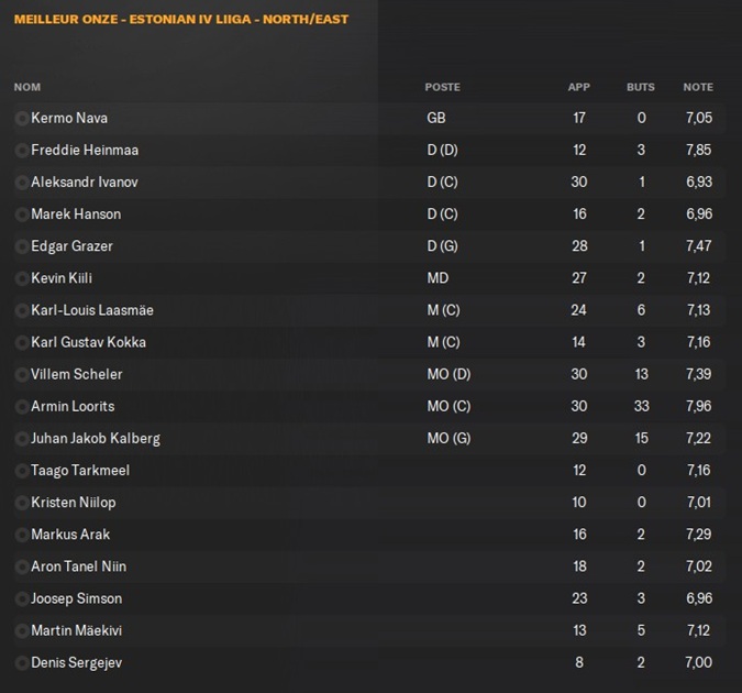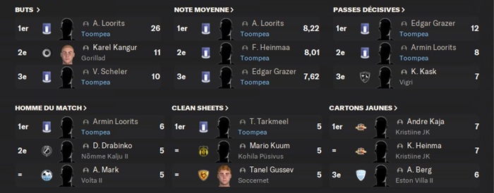 Deux recrues de la mi-championnat ce sont Ă©galement mises en Ă©vidence. Tout dâabord, lâarriĂšre droit Heinmaa avec une note moyenne supĂ©rieure Ă 8 et ensuite Tarkmeel qui a remportĂ© le classement des clean sheets en nâayant jouĂ© que la moitiĂ© des matchs !