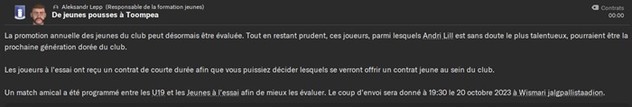 Suite à cela, Lill a obtenu un contrat (il faut bien quelques joueurs dans mon équipe U19) et mon responsable a reçu son C4