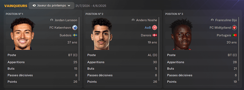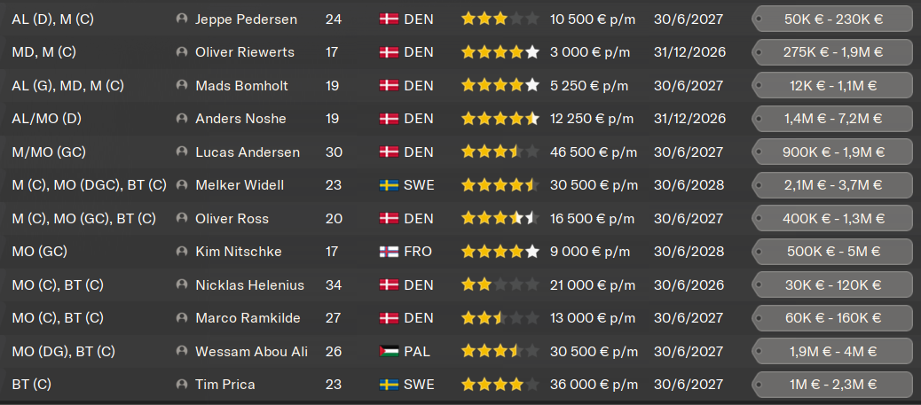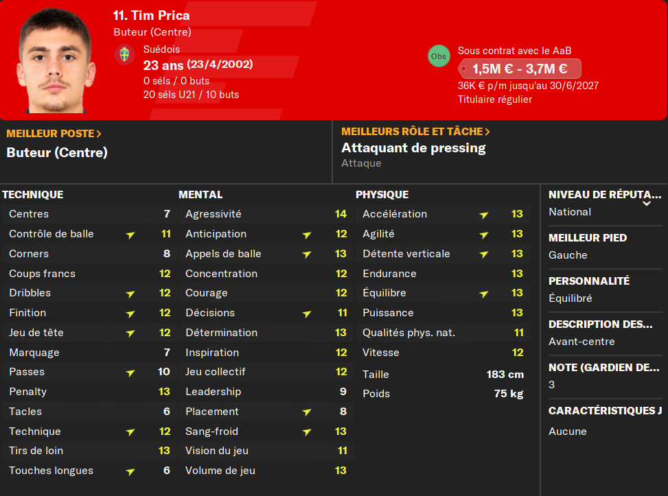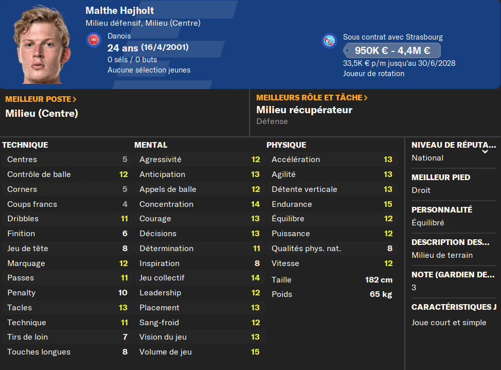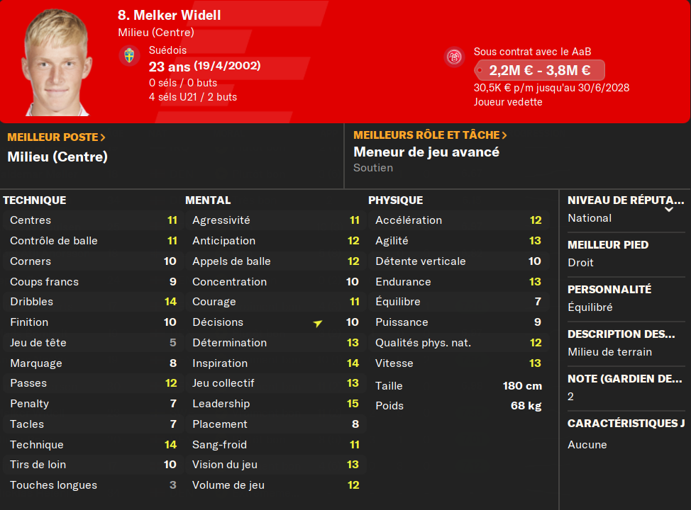 (MC) : mon suĂ©dois du milieu, titulaire depuis 2 ans, nâa pas un niveau incroyable, mais il est assez complet. Il sort de deux trĂšs bonnes saisons et sera mon atout n°1 au milieu, lĂ oĂč je nâai pas grand monde. Il fait dĂ©jĂ office de taulier Ă son Ăąge.
