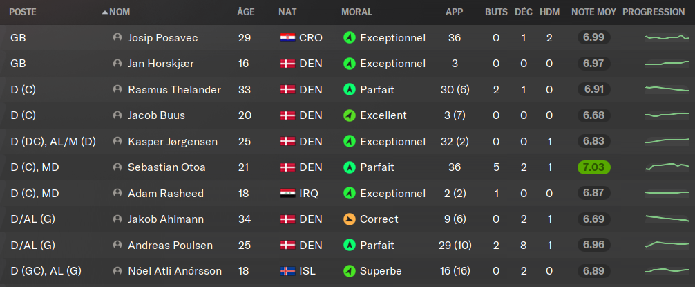 (MOC) : mon fĂ©roĂŻen prĂ©fĂ©rĂ© peine a montrer le talent quâon lui prĂȘte et quâil a certainement. En U19 il est en place, mais ses entrĂ©es en jeu en Ă©quipe premiĂšre ne sont pas incroyables sur les deux saisons passĂ©es. Il intĂšgre officiellement lâĂ©quipe premiĂšre cette annĂ©e, et aura un rĂŽle de doublure de Lucas Andersen. Ce dernier nâest plus tout jeune, et aura besoin de souffler rĂ©guliĂšrement.