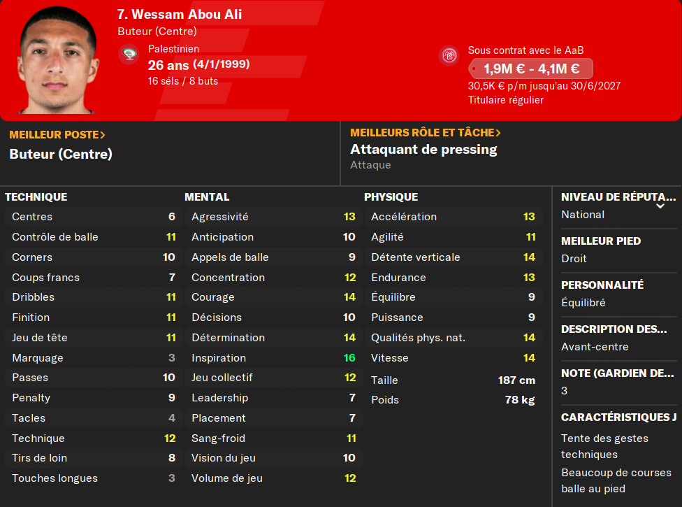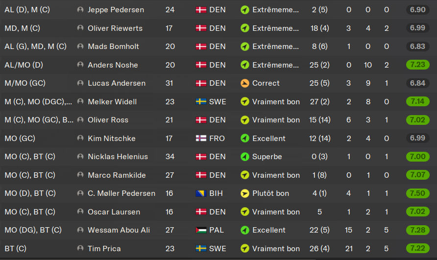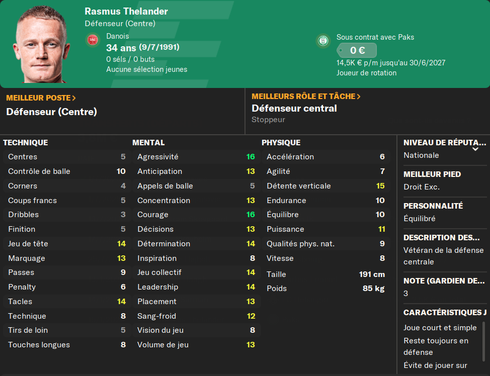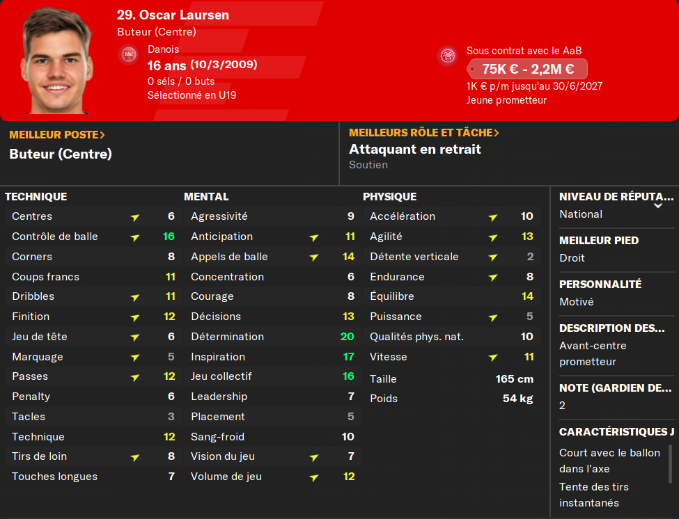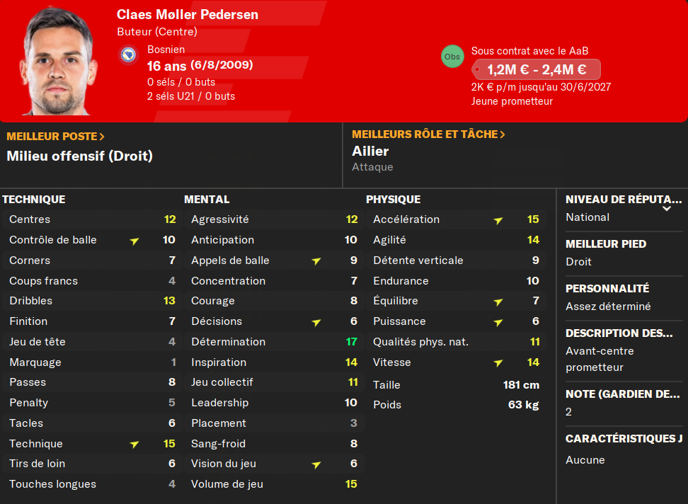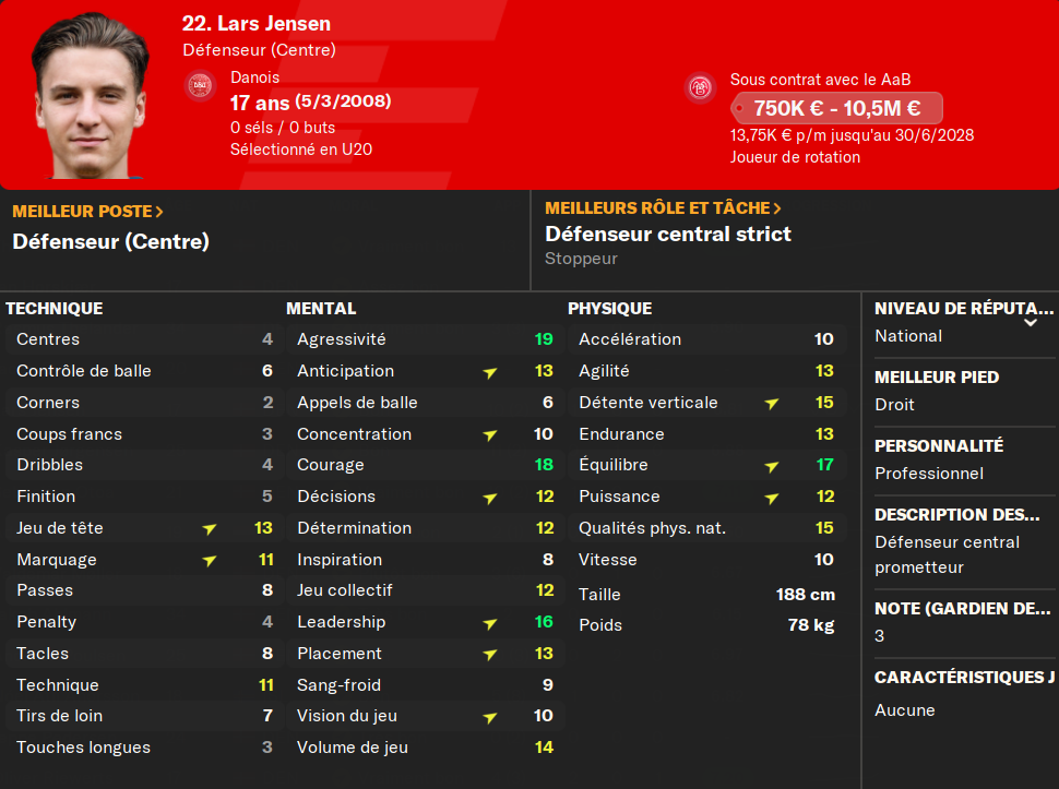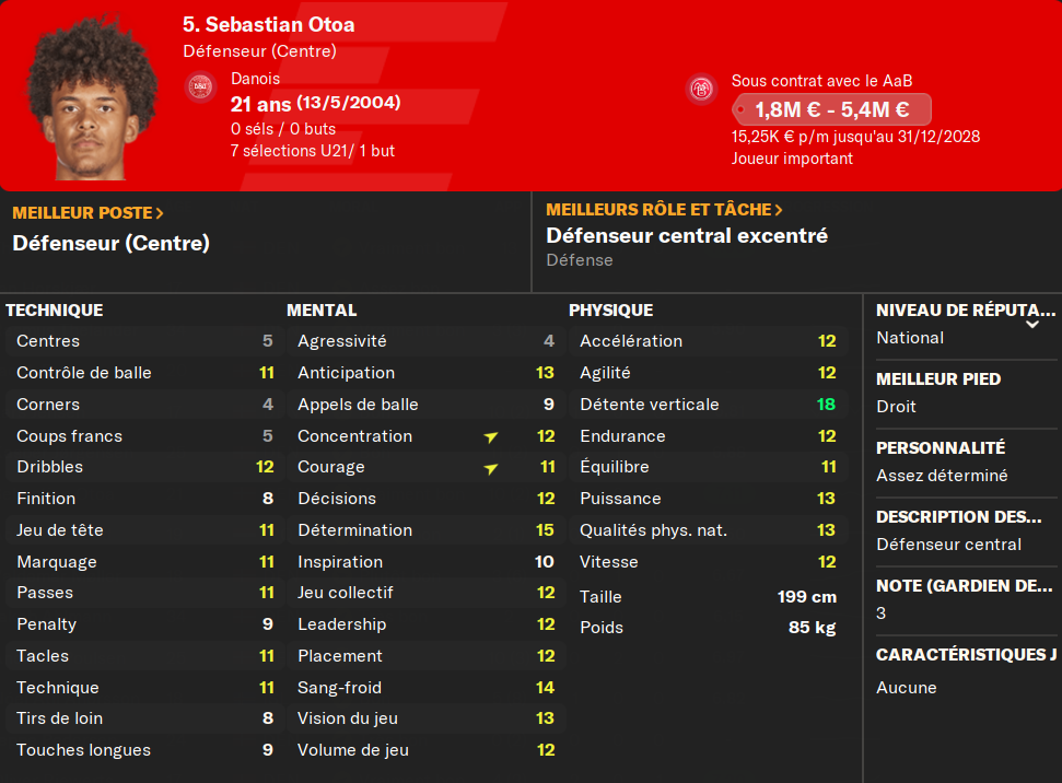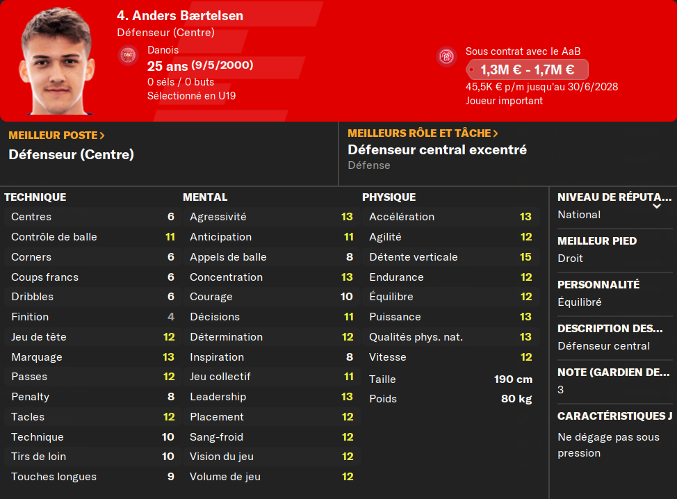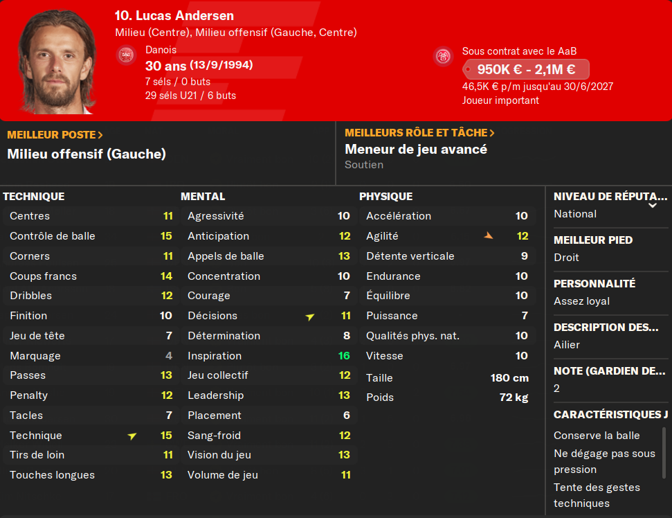 (ALD) : je prĂ©sente encore le gars ? Il mise tout sur le physique et la vitesse. Et ça marche ! Pas le meilleur techniquement, mais il compense avec un mental Ă toute Ă©preuve et un physique irrĂ©prochable. MalgrĂ© les offres du FC Copenhague, et de 3-4 autres club (en dessous de 6MâŹ), il ne quittera jamais le club si on ne mây oblige pas.