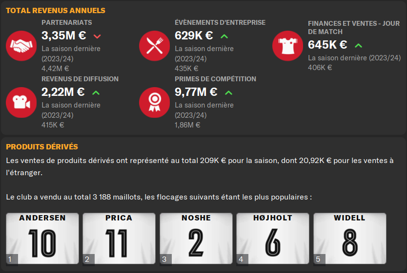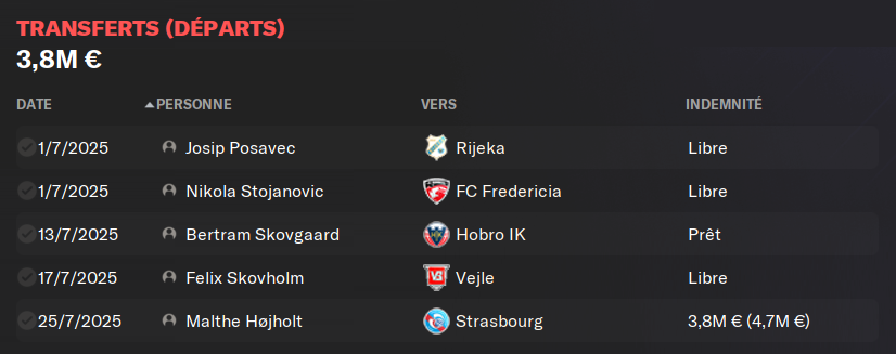 Comme prĂ©cisĂ© plus haut, deux joueurs passĂ©s par les Ă©quipes juniors du club et donc formĂ©s ici, nous rejoignent cet Ă©tĂ©. Nous avons dĂ©pensĂ© 3,6M en tout si je compte les bonus (dont certains sâactiveront avec 20 sĂ©lections en Ă©quipe nationale, ce qui est assez alĂ©atoire comme condition). Cette somme dĂ©pensĂ©e est compensĂ©e par les fonds rĂ©coltĂ©s via les ventes.