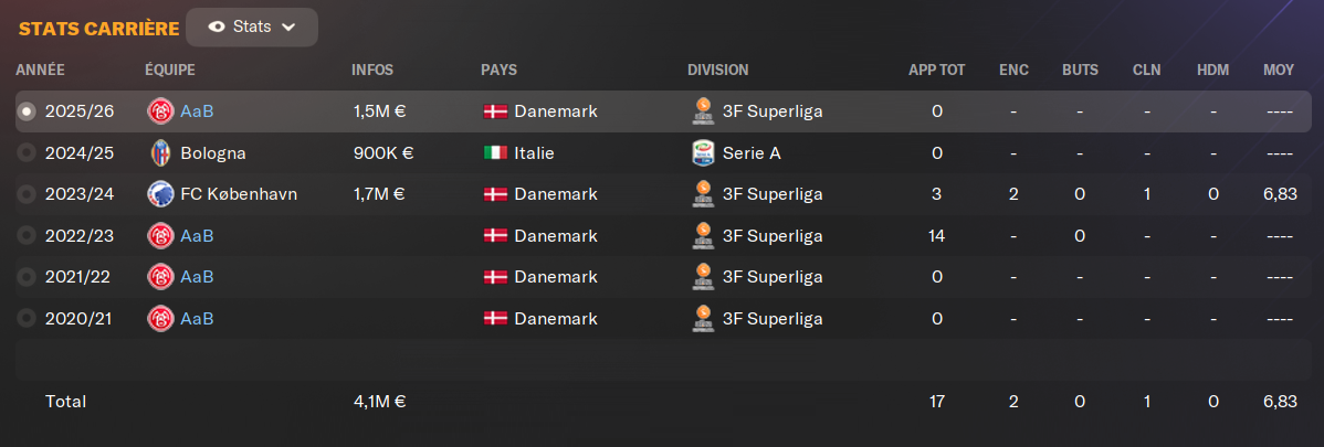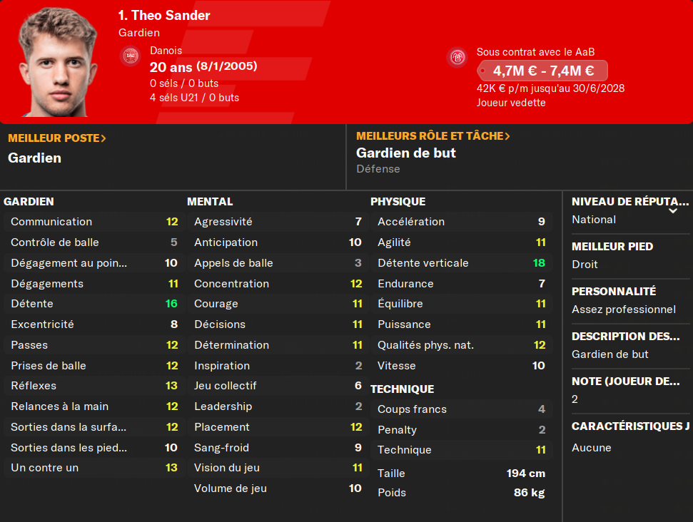 (GB) : Theo a quittĂ© le club il y a 2 ans, contre 1,7M⏠en signant au FC Copenhague. TrĂšs gros espoir national Ă son poste, il nâa pourtant jouĂ© que 3 matchs en championnat, avant de partirsâexiler en Italie. Aucun match jouĂ©, et retour Ă la case dĂ©part Ă AaB. Il a pourtant gardĂ© son talent, et dispose malgrĂ© tout dâun trĂšs bon niveau pour le championnat danois, surtout Ă cet Ăąge et avec la progression encore possible devant lui. Il va occuper les cages au moins 15 ans, si personne du centre de formation dĂ©cide de lâen dĂ©loger.