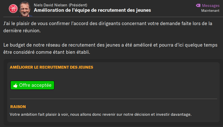 Vu les rĂ©sultats du sondage mis en place il y a une dizaine de jours, je vais me laisser tenter par le recrutement possible de joueurs passĂ©s par le centre de formation du club. Comme certains dâentre vous lâont prĂ©cisĂ©, câest dans lâesprit du Lifeban. Donc les conditions de la partie sâorientent vers la recherche de joueurs capables dâapporter une plus-value en revenant sur leurs terres de naissance. Je dois vous avouer quâen cherchant des joueurs formĂ©s au club, je nâen ai pas trouvĂ© beaucoup qui pourraient rĂ©ellement sortir du lot en revenant ici. Jâen ai comptĂ© 4.