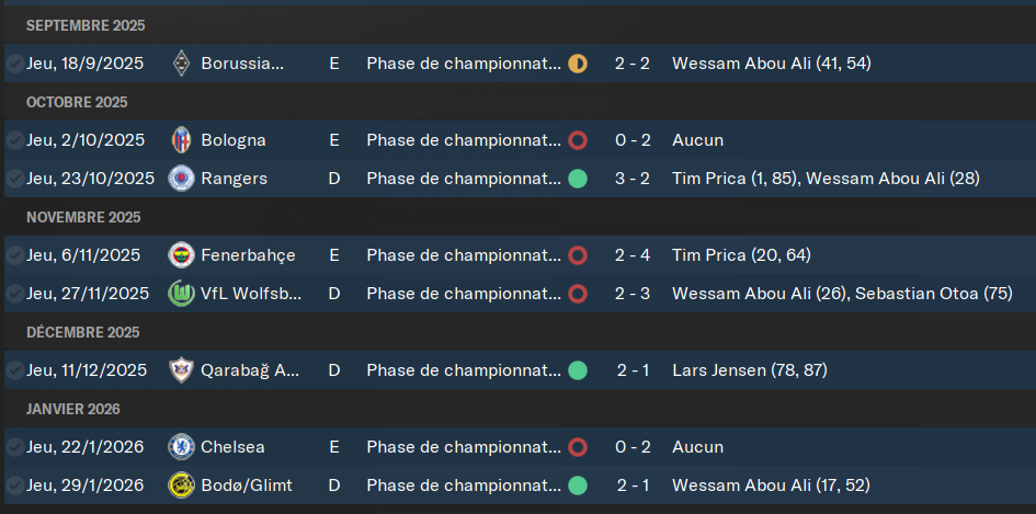 Nous aurons fort Ă faire contre Chelsea, le Borussia et Fenerbahce. Peut-ĂȘtre une chance contre les Rangers, Wolfsburg et Bologne. Et nous devrons battre Qarabag et Bodo/Glimt si nous voulons sortir la tĂȘte haute de cette compĂ©tition. Groupe homogĂšne, oĂč nous sommes mĂȘme pas considĂ©rĂ©s comme outsiders.