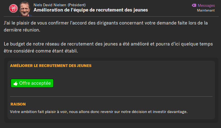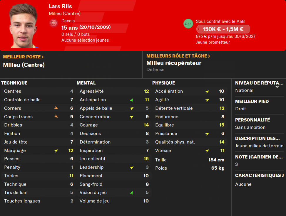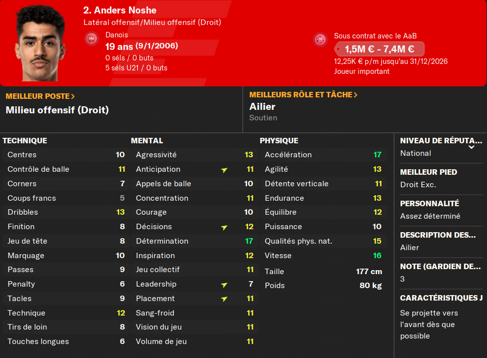 (ALD) : il est rapide⊠et voilĂ ! Sans rire, il devrait ĂȘtre au-dessus du lot en U19, et lĂ aussi je lui ferai faire quelques piges en Ă©quipe premiĂšre. Anders Noshe nâest pas prĂȘt de lui laisser du temps de jeu, mais qui sait, une blessure est vite arrivĂ©eâŠ