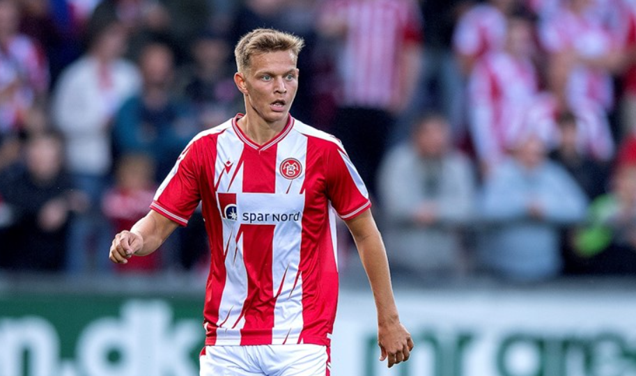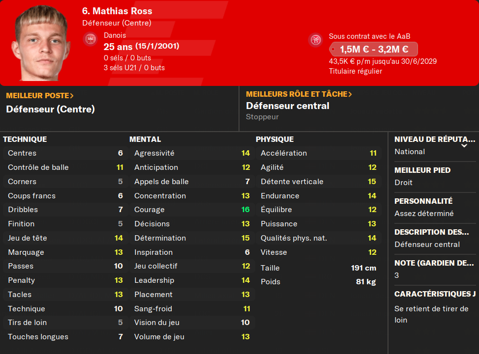 (DC) : il sâagit de mon joueur le plus courtisĂ©. Jâai refusĂ© une offre de 16M⏠venu dâAngleterre pour lui. Il est jeune, trĂšs grand, costaud, il prend tout de la tĂȘte, marque des buts, dĂ©fend bien. Il progresse encore. Il nâest pas loin de lâĂ©quipe nationale, le sĂ©lectionneur venait souvent Ă AaB pour le superviser et lâayant convoquĂ© en septembre.
