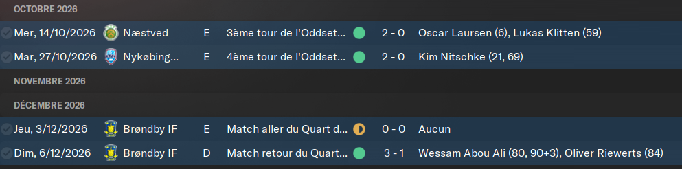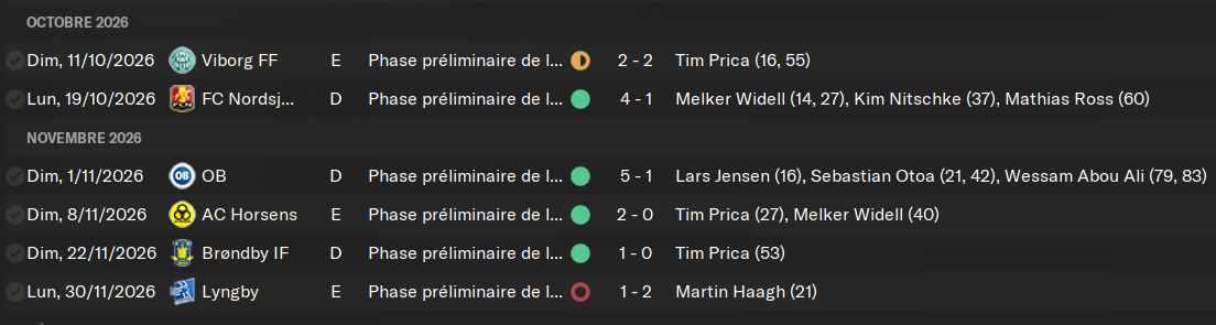 Avec ce beau parcours jusquâici, nous sommes leaders de la premiĂšre phase et dĂ©jĂ qualifiĂ©s pour la suivante. Nous avons de plus un match en moins, Ă jouer contre le FC Midtjylland. Je dois ma premiĂšre place au classement Ă©galement grĂące Ă la saison trĂšs mauvaise du FC Copenhague. Cette 4Ăšme place affreuse, avec moins de 50% de victoires depuis le dĂ©but du championnat. Leur entraineur sâest fait virer, normal. Je suis ravi. Brondby nâest pas loin, mais nous pouvons les distancer avec notre match en retard et les repousser Ă 9 points.