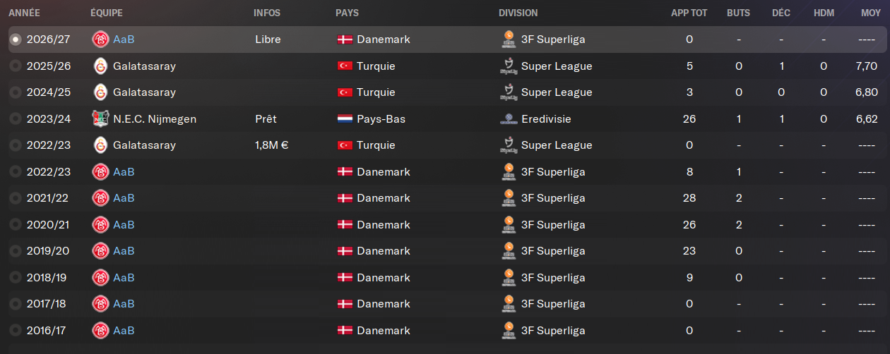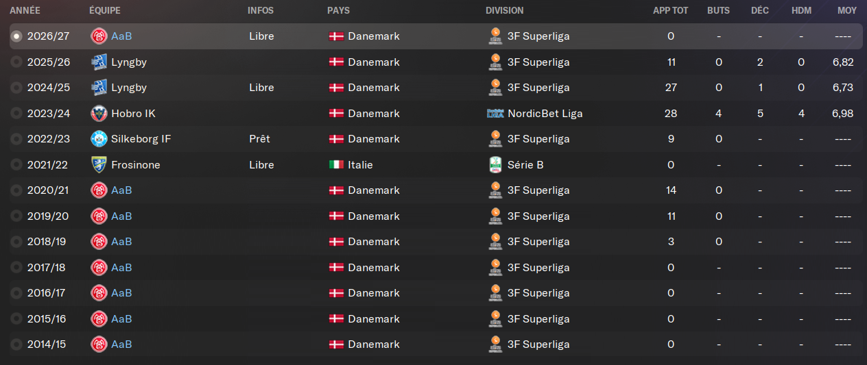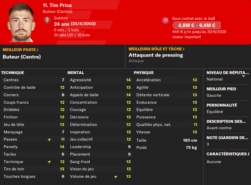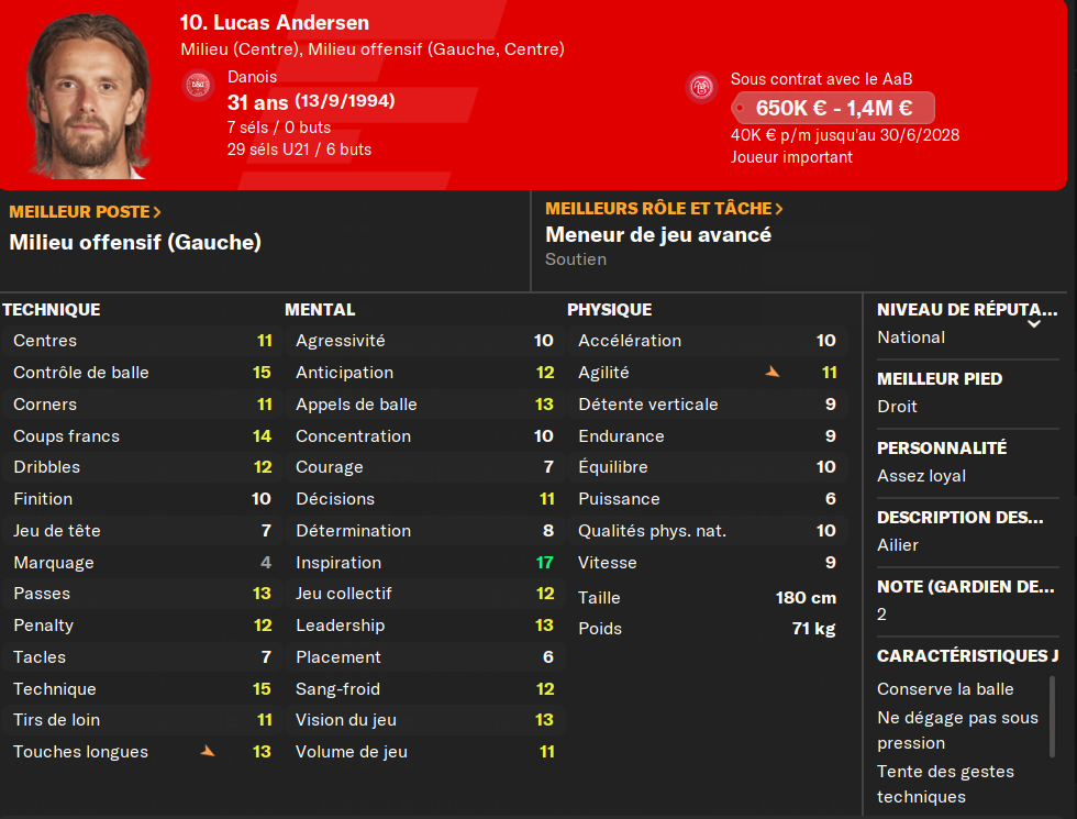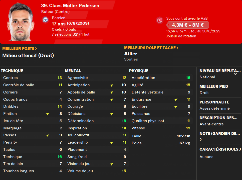 (BU) : il est tout simplement mon meilleur attaquant et le meilleur buteur du championnat danois les deux derniĂšres saisons consĂ©cutives. Il sâagit dâun de mes meilleurs joueurs. Son profil complet lui sert bien, et il plante beaucoup de buts. Il sera encore cette saison le fer de lance de mon Ă©quipe.