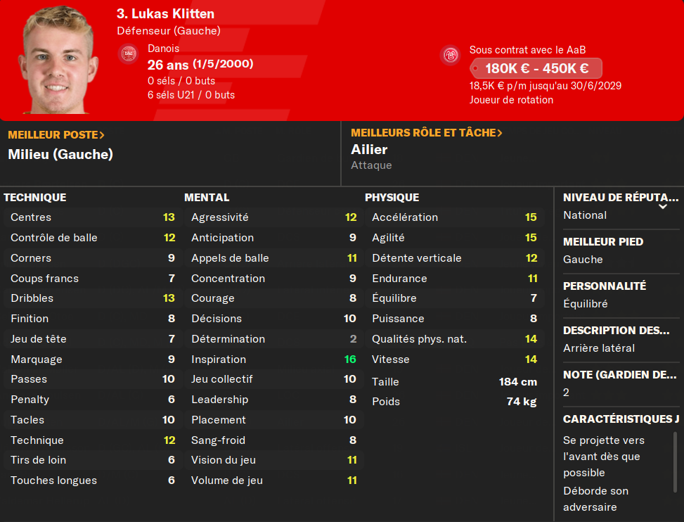 (ALG) : lâun des jumeaux Klitten revient Ă la source. Le dĂ©part Ă la retraite de Jakob Alhmann mâa poussĂ© Ă chercher un latĂ©ral gauche pouvant servir de doublure Ă Andreas Poulsen. Certes il nâa pas le niveau Ligue des Champions, mais pour le championnat danois, avec sa vitesse et sa qualitĂ© de centre, je sais quâil sera utile. LĂ©ger en dĂ©fense, câest un peu embĂȘtant, mais on lui demande plutĂŽt dâĂȘtre bon en attaque vu le rĂŽle de mes latĂ©raux.