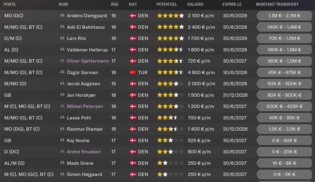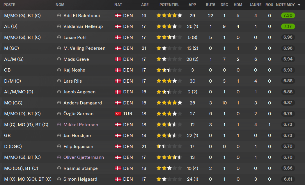 (BU) - REGEN : lui aussi câest lâavenir du club. De magnifiques notes dĂ©jĂ pour son Ăąge. Le buteur de poche a dĂ©jĂ bien progresser en 16 mois. Comme son ami Claes, il va jouer plus cette annĂ©e en Ă©quipe premiĂšre. JâespĂšre quâil fera gonfler ses statistiques, et quâil montrera Ă tout le Danemark lâĂ©tendue de son talent.
