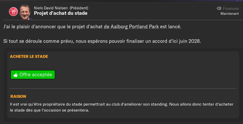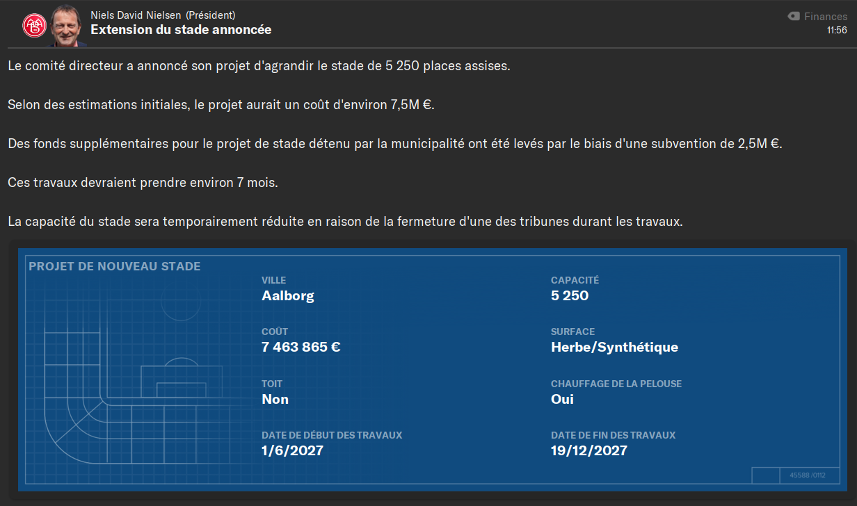 PremiĂšre trĂšs bonne nouvelle, nous allons probablement devenir propriĂ©taire du stade Aalborg Portland Park. Ce qui a motivĂ© le comitĂ© directeur pour lâagrandir, avec 5250 places assises supplĂ©mentaires, ce qui donnerait une capacitĂ© totale de 17.800 places. Ce projet sâannonce primordial Ă lâexpansion du club, notamment avec lâavenir europĂ©en en Ligue des Champions. Nous devons avoir un stade digne de ce nom.
