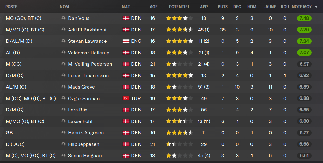 Nous sommes champions !! Pour la premiĂšre fois depuis mon arrivĂ©e et surtout premier trophĂ©e en championnat depuis 2014. Nous mettons un terme Ă la domination nationale du FC Copenhague, qui trustait la premiĂšre place depuis 5 ans. Grosse surprise dâailleurs pour mes meilleurs ennemis, qui terminent Ă la 4Ăšme place, aprĂšs une saison catastrophique. Leur changement dâentraineur les a aidĂ© Ă remonter un peu, mais pas assez. Nous devons notre titre Ă deux choses donc : notre belle saison avec 22 victoires en 32 matchs, mais aussi, et il faut pas le nier, la trĂšs mauvaise saison des favoris. Nous en profitons, nous sommes sur le toit du Danemark !