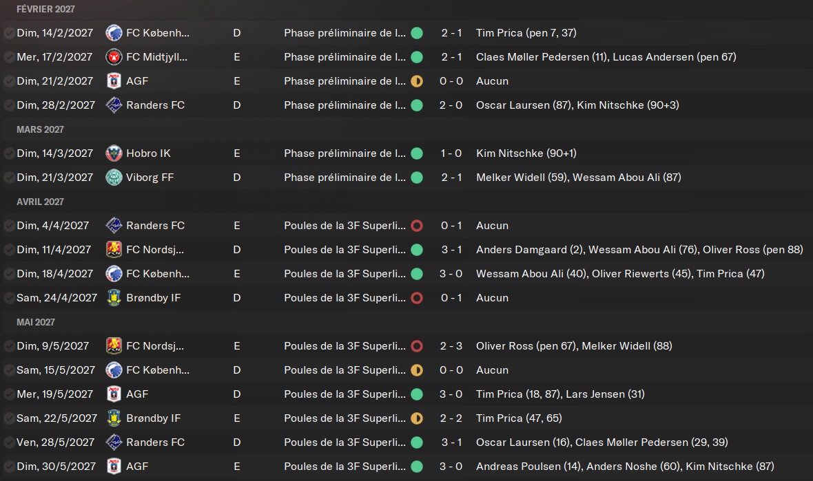 8 jours aprĂšs la prĂ©sentation des regens de cette quatriĂšme saison, voici que je vous montre aujourdâhui la fin de cet exercice 2026 / 2027. A la mi-saison, nous Ă©tions dans une trĂšs bonne dynamique. Premiers au classement en championnat, qualifiĂ©s en demi-finale de Coupe du Danemark et surtout aussi en 1/8Ăšmes de finale de la Conference League. Bref, tous les voyants Ă©taient au vert. Que va t-il se passer ? Vais-je gagner mon premier trophĂ©e ? RĂ©ponse ci-dessous.