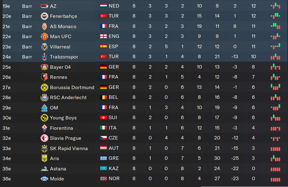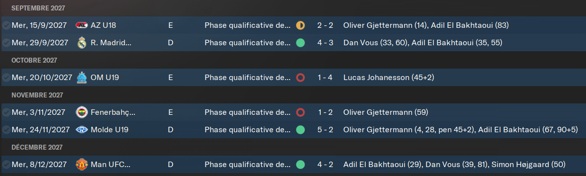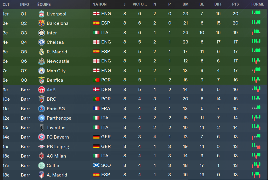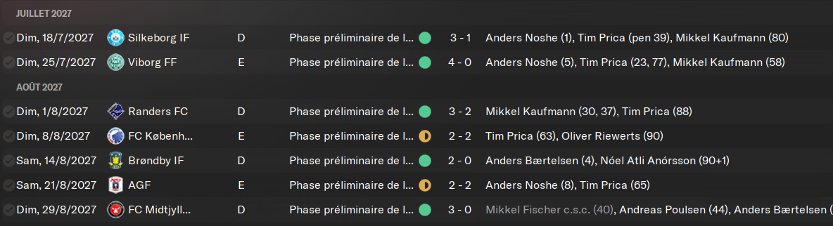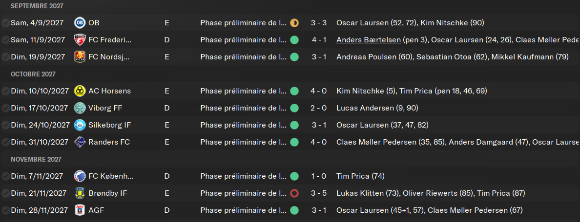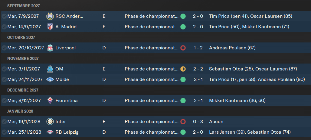 Tout les voyants sont au vert ici. SystĂ©matiquement, les « contre-performances » ont lieu lorsque je ne peux pas aligner mon Ă©quipe titulaire. Souvent avant les matchs de Ligue des Champions. Je joue le dimanche en championnat et le mercredi en Europe. Câest chiant, jâai moins de 3 jours de repos. Donc je fais jouer une bonne partie de mes remplaçants. Je laisse des points en route, mais ce nâest pas encore prĂ©judiciable. Notre seule dĂ©faite est contre la belle Ă©quipe de Brondby, celle qui nous pose le plus de problĂšme depuis le dĂ©but de la partie. On prend 5 buts dans la face quand mĂȘmeâŠ