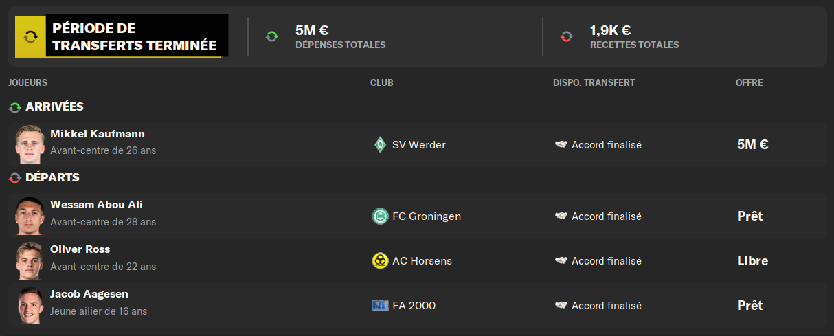 Aagesen, un jeune regen, va prendre du temps de jeu ailleurs, et Wessam Abou Ali a souhaité partir suite au recrutement de Kaufmann, qui prend sa place dans le 11 titulaire.