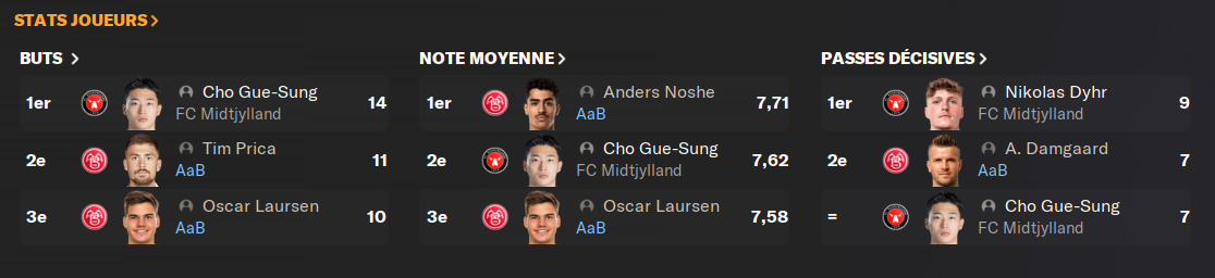 Mon Ă©quipe est en tĂȘte du championnat. Certaines Ă©quipes ont un match en moins, le classement est donc un peu tronquĂ©. Comme lâannĂ©e derniĂšre, le FC Copenhague, favori pour remporter la compĂ©tition, déçoit Ă©normĂ©ment. Seulement 50% de victoires pour un prĂ©tendant au titre, câest beaucoup trop peu. Nous avons une trĂšs bonne diffĂ©rence de buts en tout cas.