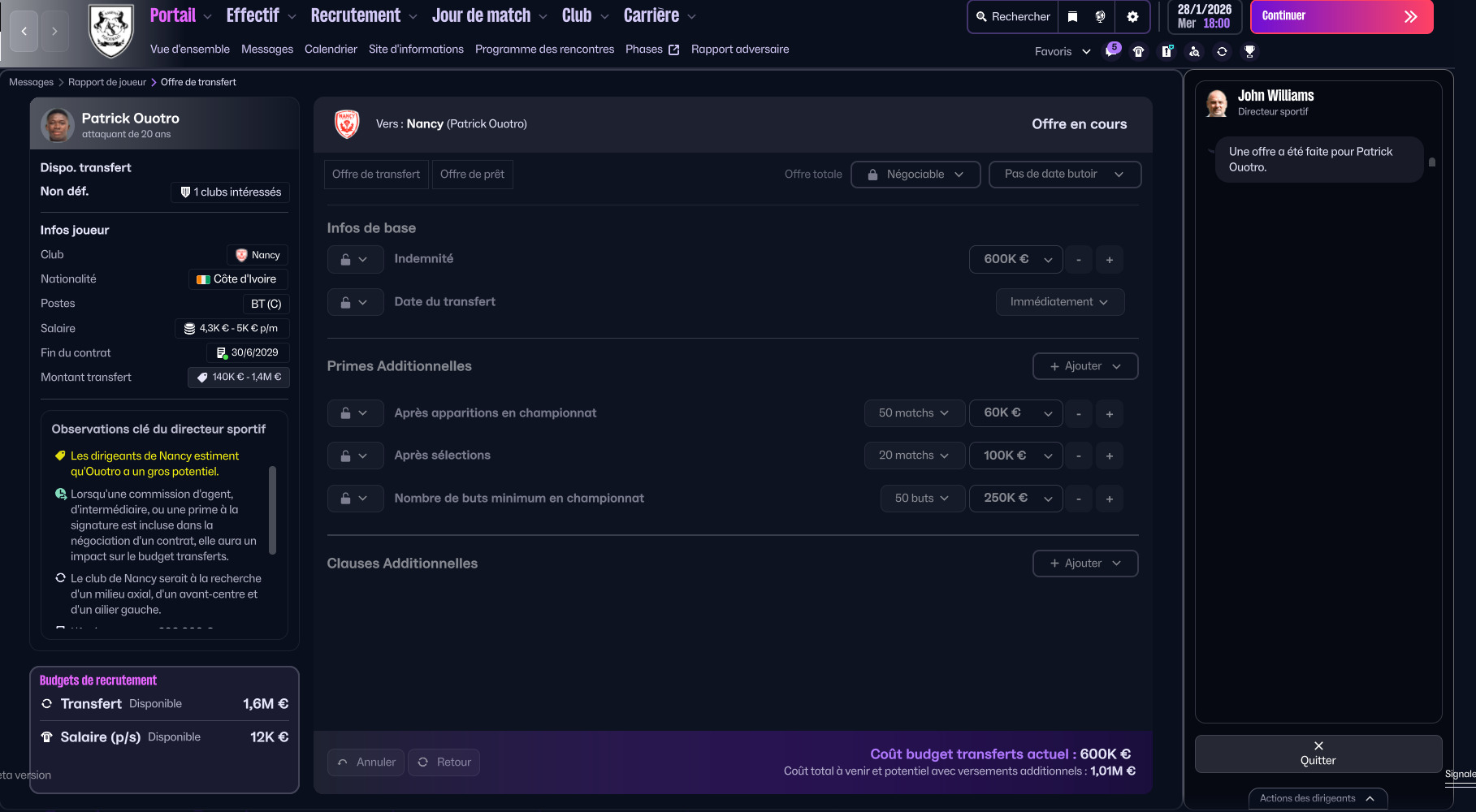 Je fais une offre pour Ouotro, refusée par Nancy. Sauf que derrière, je ne peux plus faire de nouvelle offre pour lui, il n’y a que l’option « quitter » qui fonctionne et même en avançant de plusieurs jours, le problème persiste.