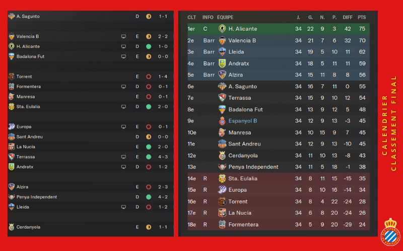 Il est a notĂ© que la direction aura pris connaissance des difficultĂ©s quâelle avait imposĂ© au coach Aleix avec les prĂȘts forcĂ©s des U19, les longues et nombreuses rĂ©quisitions des joueurs par lâĂ©quipe A et lâabsence de recrutement. Sans parler du prĂȘt du capitaine de lâĂ©quipe : Joan Puig ! Ce qui a quand mĂȘme pas mal dĂ©stabilisĂ© la charniĂšre dĂ©fensive. En effet, Joan Capdvila, PrĂ©sident du club, aurait proposĂ© une prolongation de contrat Ă Aleix Palau-Davet qui aurait nĂ©gociĂ© deux annĂ©es de plus au sein de lâĂ©quipe B de lâEspanyol Barcelone ! Bonne chance Ă eux dans leurs objectifs ! »