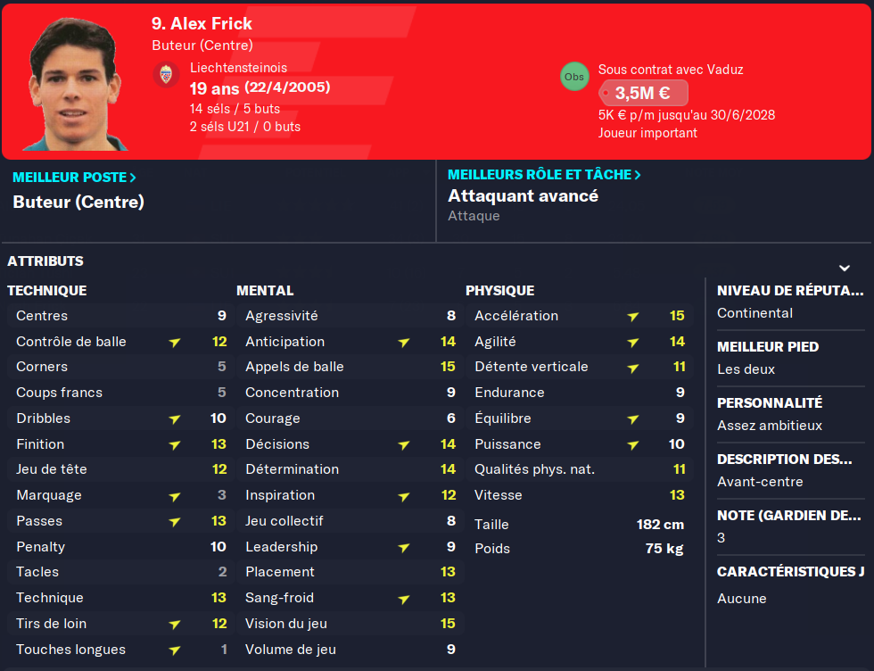 Cela fait maintenant 2 ans que jâai commencĂ© ma carriĂšre de professionnel. Jâai 19 ans, je suis liechtensteinois et jâĂ©volue au FC Vaduz. Avant mĂȘme que la saison se termine, jâai senti sur mes Ă©paules le poids de mon avenir qui allait se dĂ©cider ou non, dans les semaines qui allaient suivre. ConsidĂ©rĂ© comme le plus talentueux footballeur liechtensteinois que les spĂ©cialistes nâont jamais vu, de trĂšs nombreuses paires dâyeux sont braquĂ©es sur moi. Je sais que les dirigeants accepterons les premiĂšres offres qui feront sauter la clause libĂ©ratoire de 3,5MâŹ. Ils ne peuvent pas passer Ă cĂŽtĂ© dâune si grosse sommes. Je veux rester maitre de mon destin, et jâhĂ©site encore. Quelle tournure va prendre ma carriĂšre⊠?