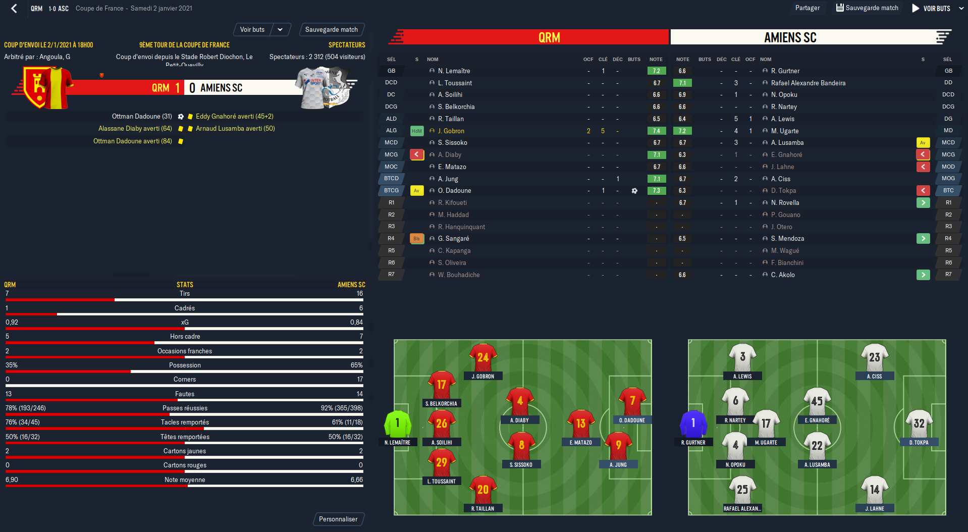 Grosse contre performance de l’équipe qui se loupe totalement lors de ce match de coupe de France. Le coach avait décidé de faire tourner l’équipe et donner du temps de jeu au jeunes. C’est un mauvais calcul pour le coach, Amiens échoue et le coach ne rempliera pas un critère de la direction : Aller au moins au 10e tour de la coupe de France.