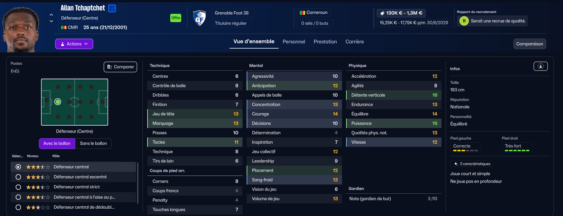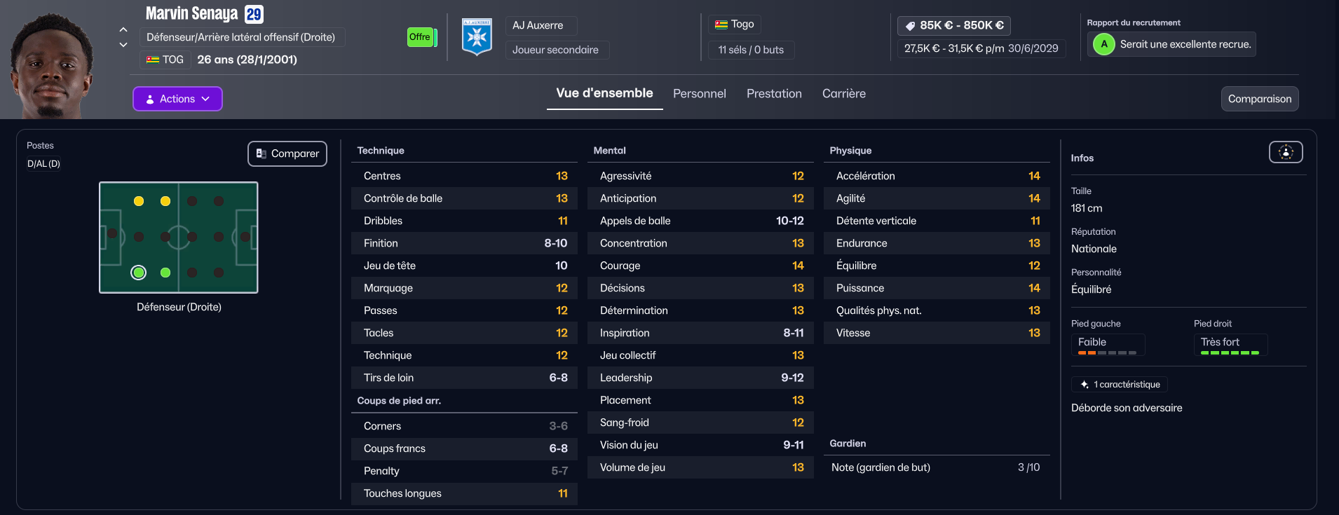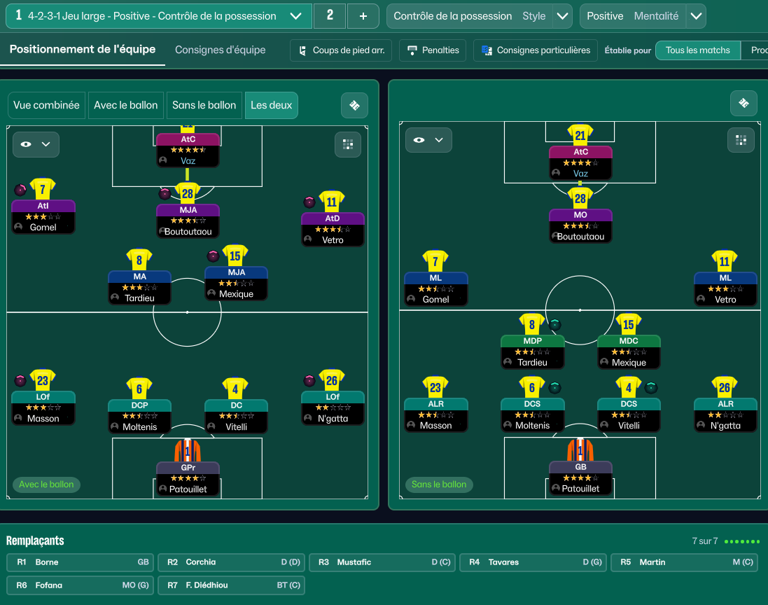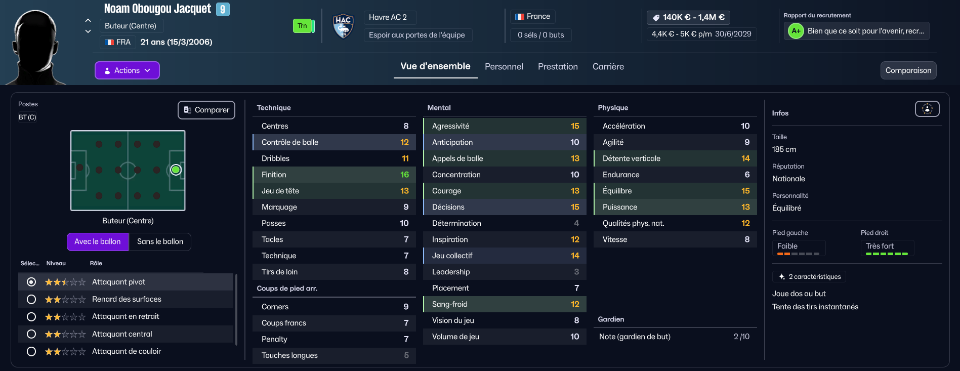 Nous craquons le portefeuille pour une attaque prometteur du Havre qui est né à Besançon : Noam OBOUGOU JACQUET. Son arrivée nous coûte pas moins de 1M€ ! Il a un beau potentiel, mais son point noire est sa détermination très basse …
