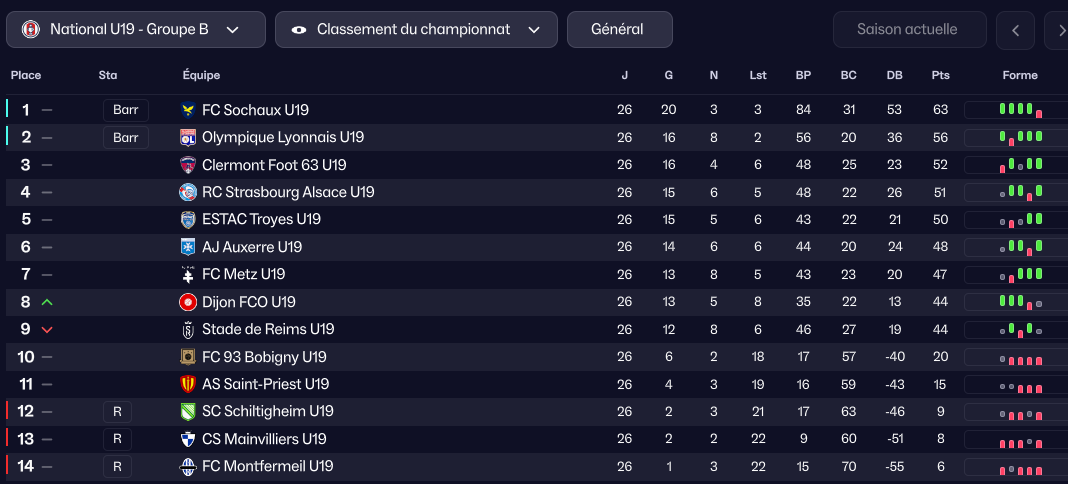 | 10/5/26 | Stade Bernard-Maroquin | CS Mainvilliers | National U19 - J26 | 6-0 | R. Boe Bozeme (14, 68) J. Rakotomanga (36) B. Diawara (42, 65) S. Ndiaye (77) | G. Fofana (14) J. Herrmann (36) R. Boe Bozeme (42, 77) S. Françoise (65) J. Rakotomanga (68) | R. Boe Bozeme(10.0) |