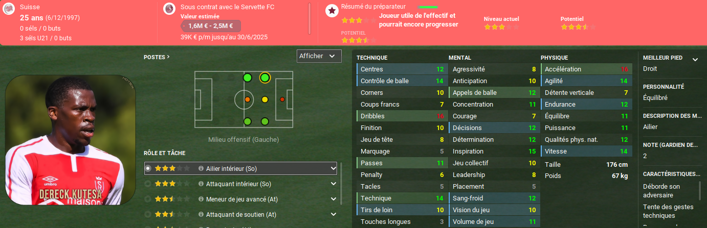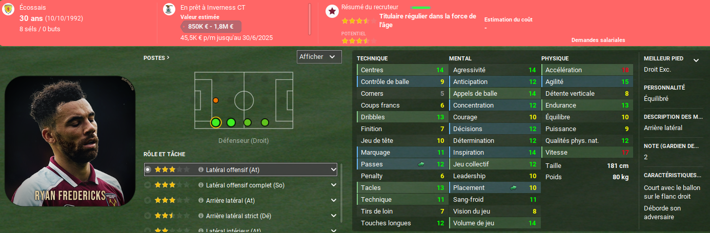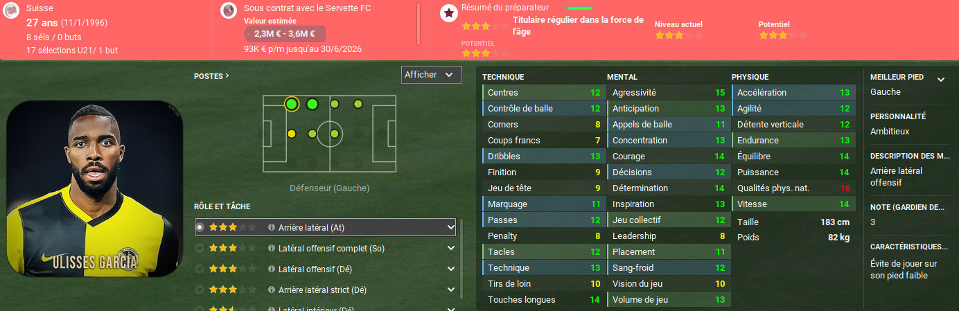 Alerte boulette! Nous avons recruté un latéral droit de haut niveau pour une somme relativement importante et je souhaitais l’installer immédiatement dans notre onze de départ, Anthony Sauthier étant plutôt décevant. MAIS, je n’avais pas fait attention à un détail bien particulier du championnat suisse. Une fois enregistré, un joueur, même s’il part, continue à compter dans la liste. Et comme il faut douze joueurs formés en Suisse… Eh bien je ne peux pas l’inscrire. Après Xavi Simons l’an dernier, c’est donc Ryan qui ne pourra pas jouer avec nous. Il est heureusement prêté à Inverness où il gardera la forme.