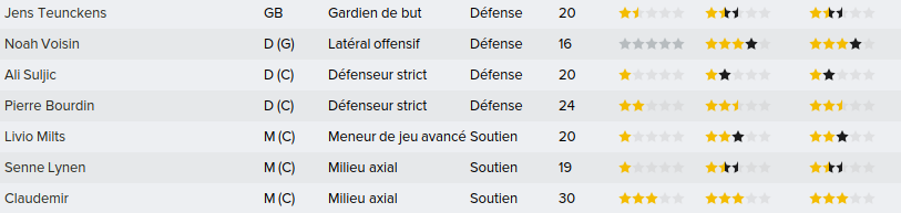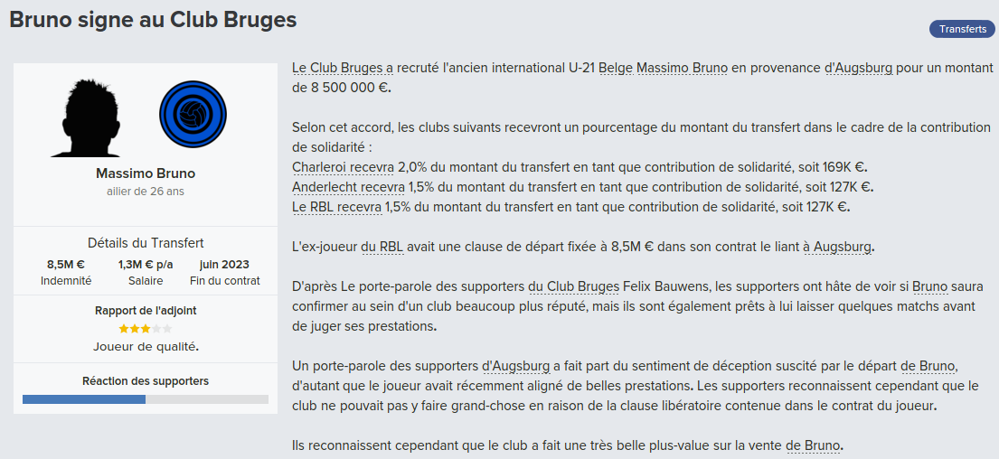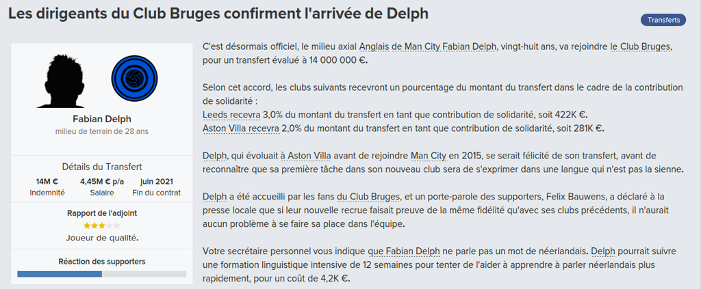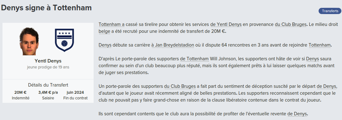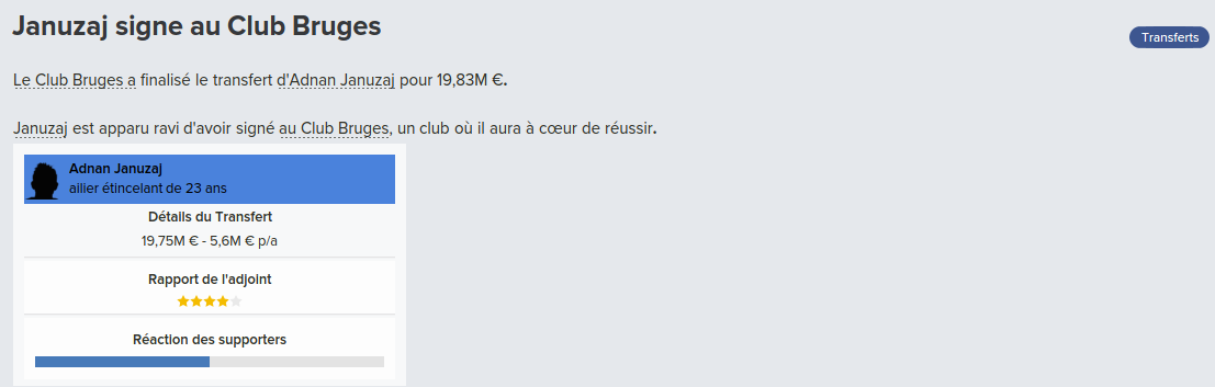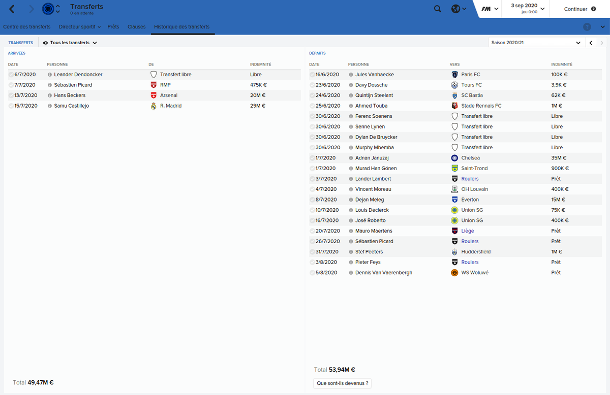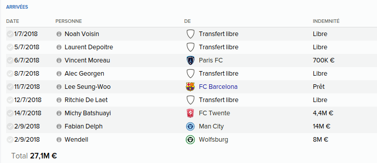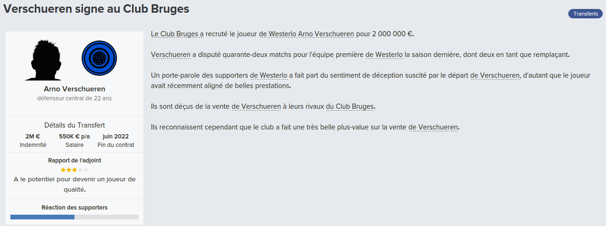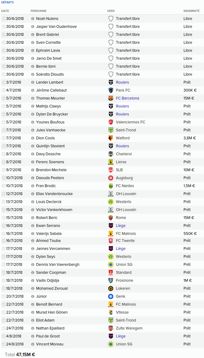 Mot du Coach: 18,8M€ d’encaissé, 0€ de dépensé pour palier les départs de mes deux défenseur droits. Voilà une bonne gestion des finances, maintenant à voir si De Laet sera à la hauteur. Georgen lui a encore de la marge avant d’avoir exploité tout son potentiel.