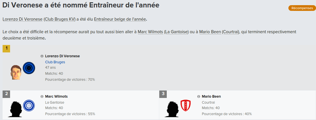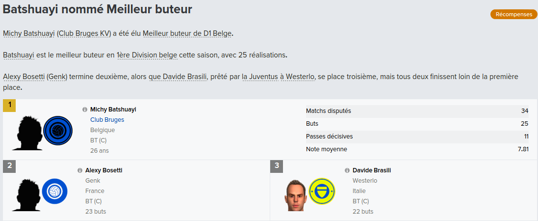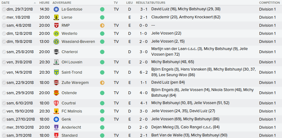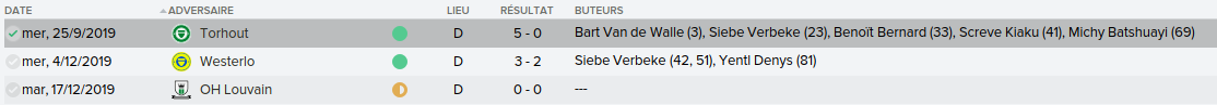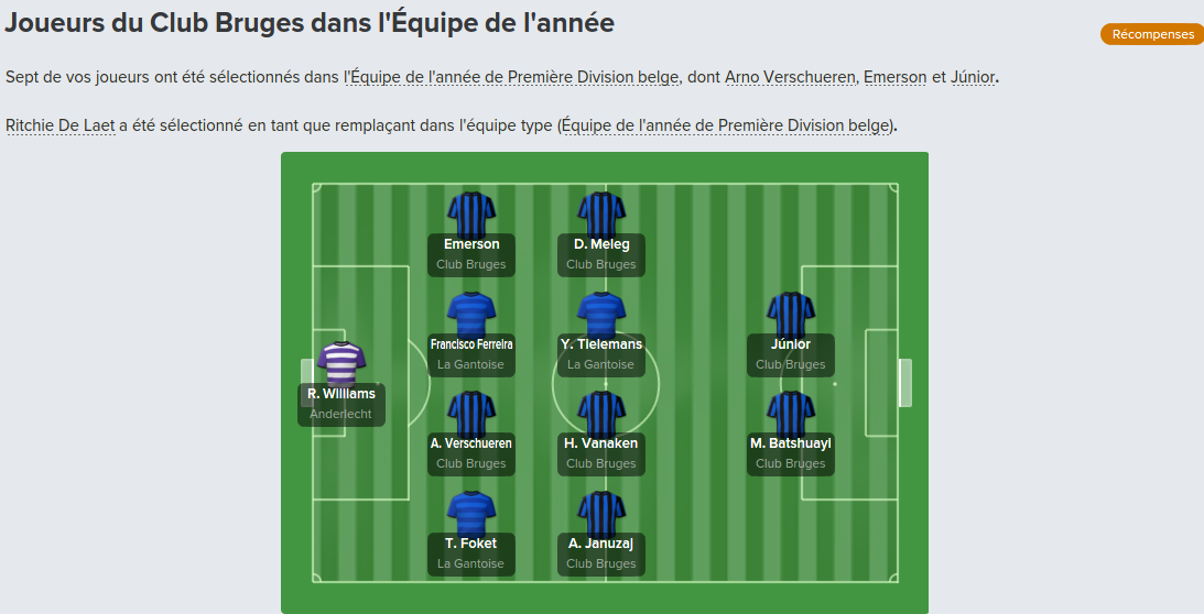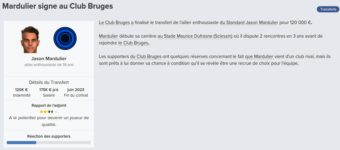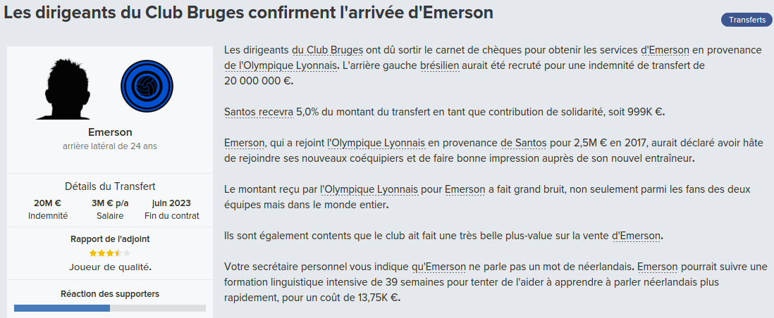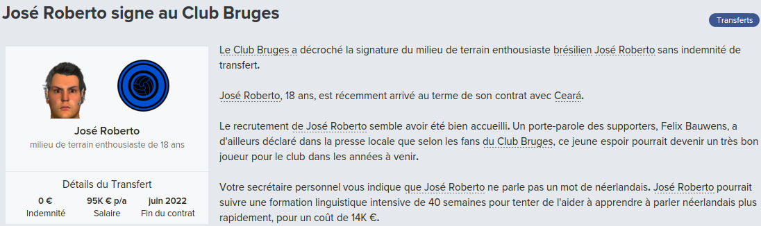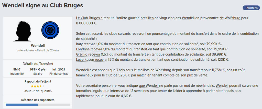 Mot du Coach: Suite au départ de Meunier, j’avais promis à Vanaken des renforts, c’est chose faite avec la venue de Wendel, très peu utilisé par Wolfsburg, j’espère qu’il apportera l’expérience nécessaire pour la ligue des champions.