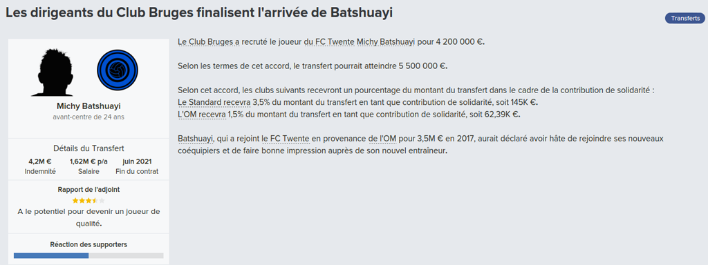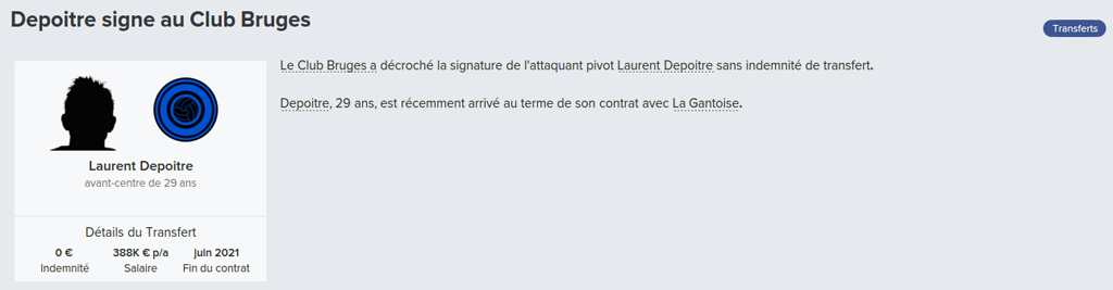 Mot du Coach: Il était demandé de partout, et c’est finalement en série A que Beric s’en va, au passage nous avons réalisé un belle plus-value puisqu’on avait acheté le slovène 1,5m€ et qu’on le revend 10 fois plus cher. Nous avons aussi preté Junior, ce qui fait qu’on avait plus qu’un buteur à savoir Jelle Vossen. Le première à arriver dans la Venise du Nord, c’est Laurent Depoitre. Malgré qu’il évoluait chez nos rivaux, il a été bien accueilli par nos supporter. Pour la bonne rotation de l’équipe Lee Seung-Woo revient en prêt. En enfin, il sera chargé de remplacer Beric, Michy Batshuayi revient sur les terrains de Jupiler Pro League