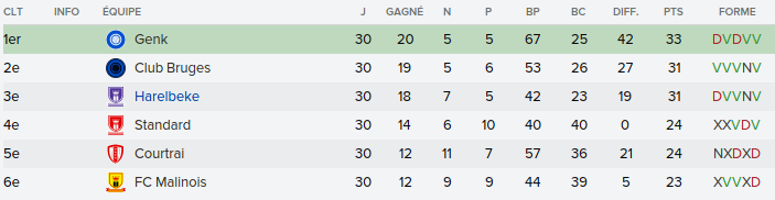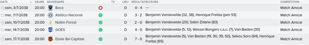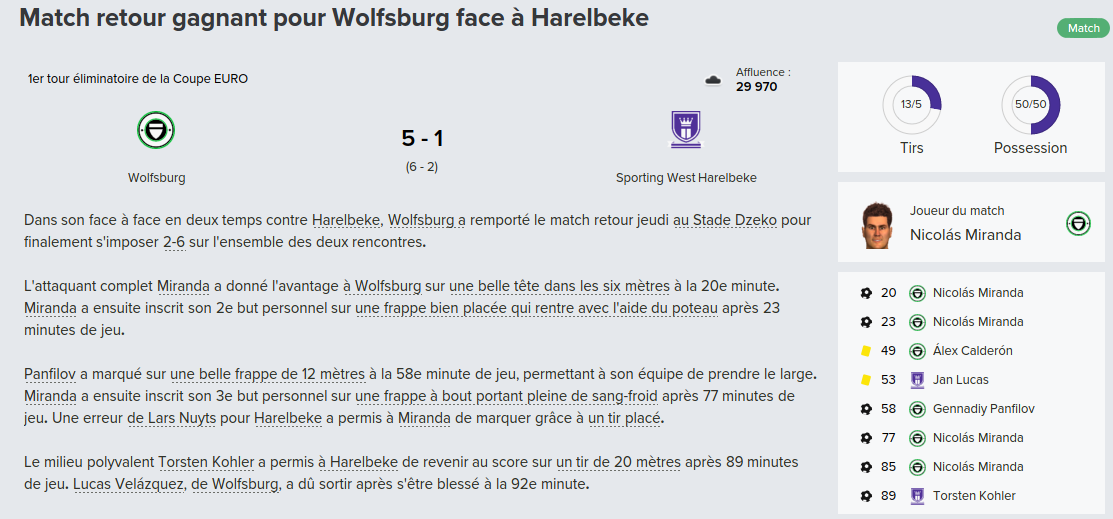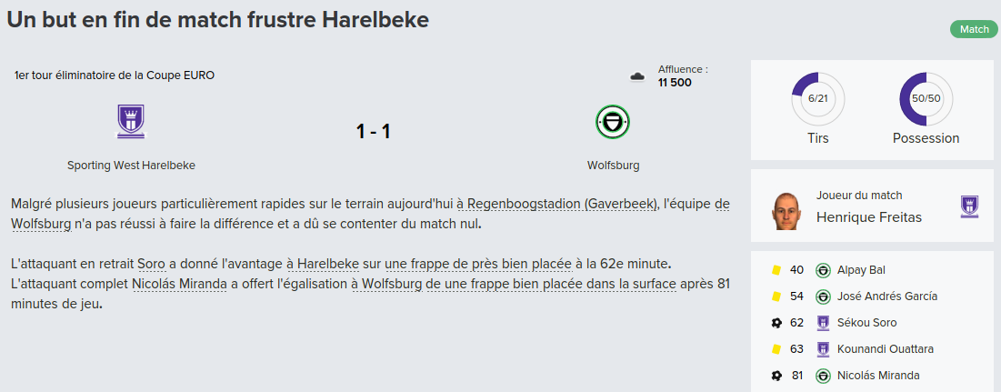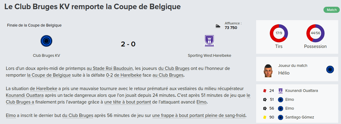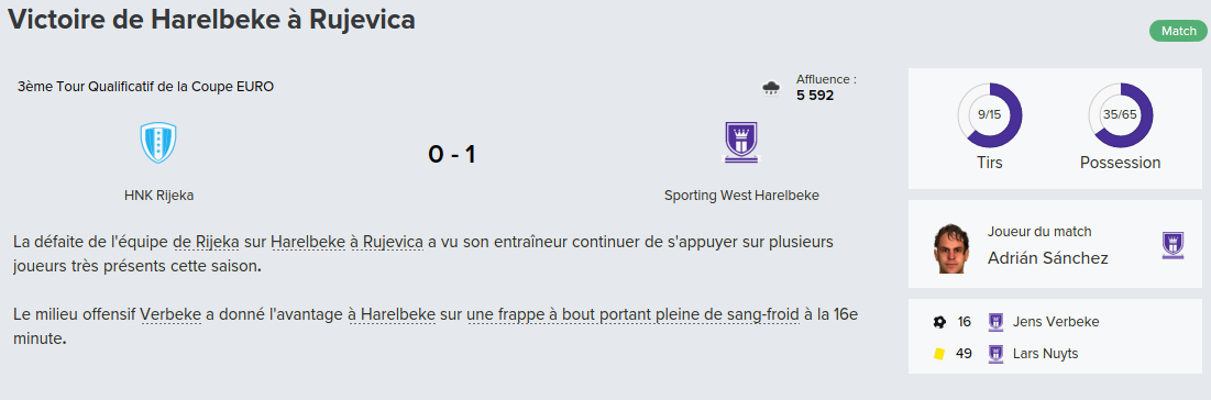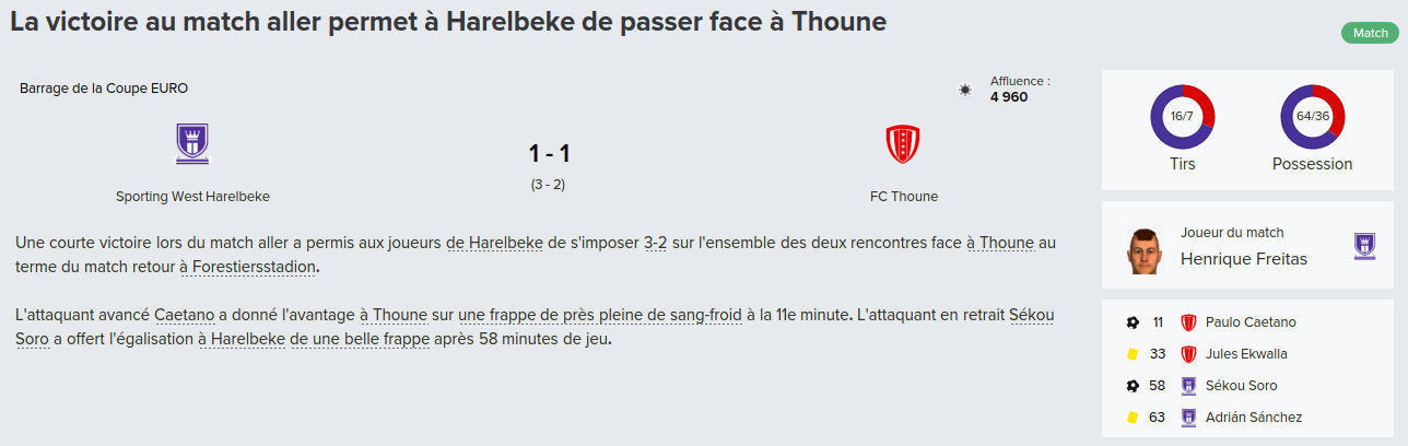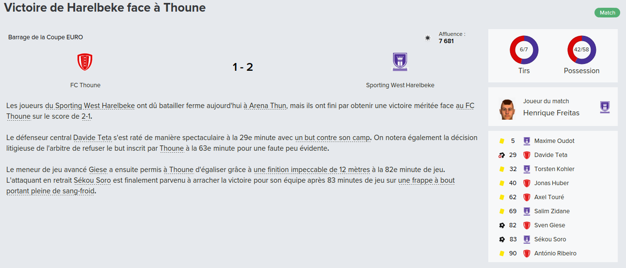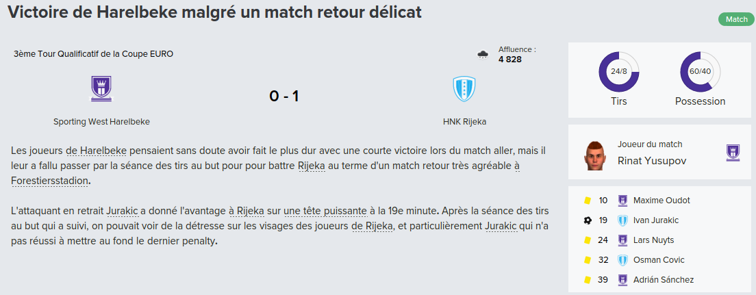 Mot du Coach: Match serré de part et d’autres, les mauves prennent rapidement l’avantage, on pousse pour revenir. Blanchet ne craque pas lors du penalty, ce qui nous permet de disputer les prolongations. le temps passe et le score ne bouge pas, mais Blanchet nous délivre à deux minutes du terme. On jouera les barages de l’Europa League la saison prochaine.