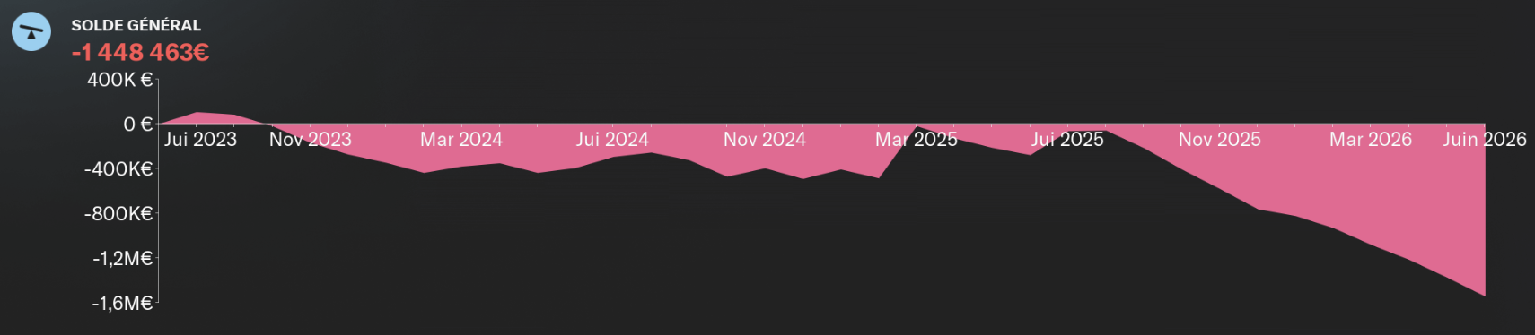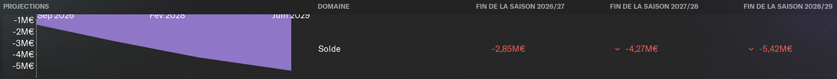 Le solde gĂ©nĂ©ral est encore largement nĂ©gatif de 1 400 000âŹ, malgrĂ© des efforts de gestion. La montĂ©e en 3e division a bien Ă©videmment fait grimper les salaires des joueurs et du staff, mais les rentrĂ©es dâargent ne suivent pas encore le rythme de cette progression. Autrement dit, câest un peu la merde pour gagner de lâargent.