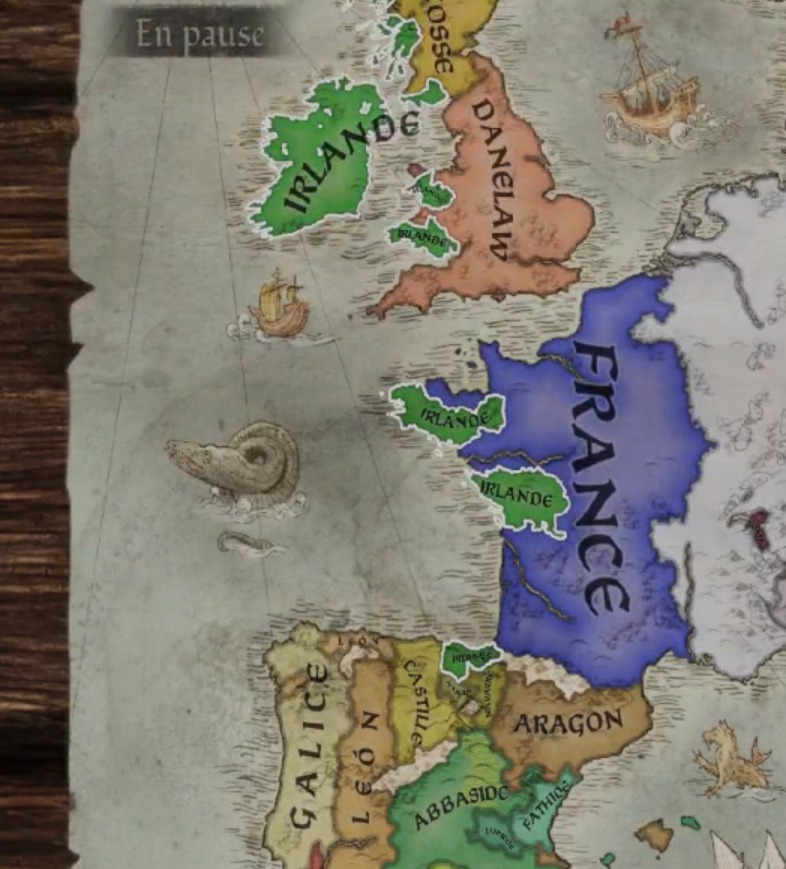 Je viens de capter un truc : j’avais créé le Royaume d’Irlande, mais je pense que même si mes conquêtes hors du royaume de jure apparaissent comme « Irlande » elles ne font pas partie du royaume en tant que tel. Du coup logique qu’à ma mort mon héritier récupère le royaume complet, et son frère ce qu’il y a en dehors. Même si j’avais créé le royaume Pays de Galles ça aurait été pareil. Et du coup ptet qu’il a même pas créé le royaume…
