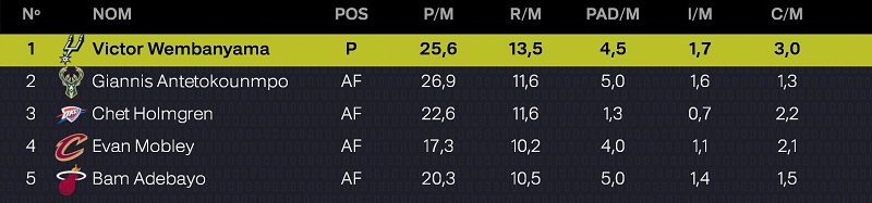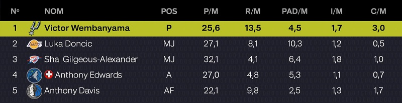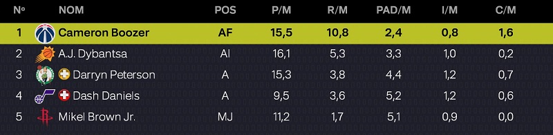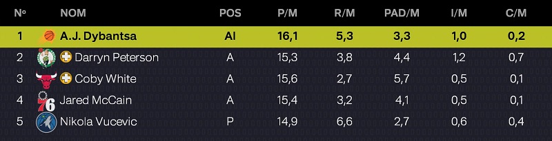 | JOUEUR | MJ | MIN | PTS | RBDS | PDS |