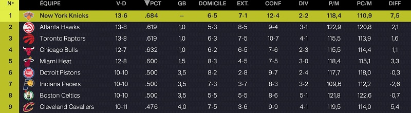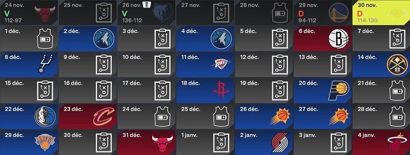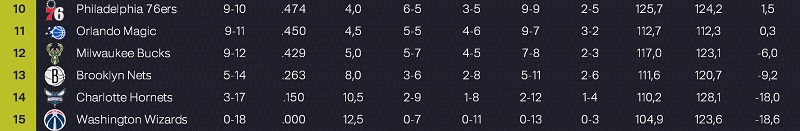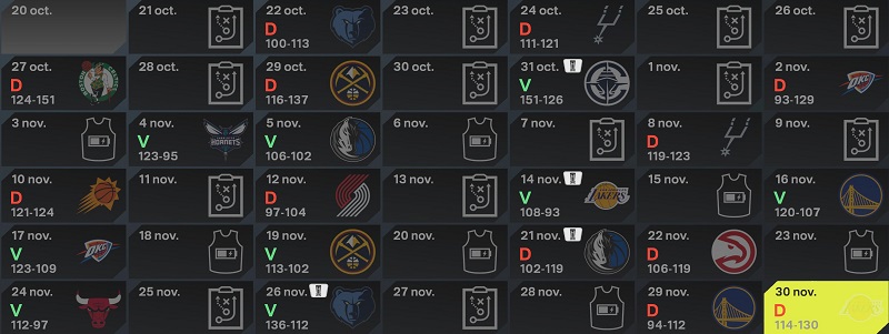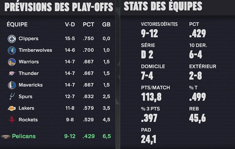Toutefois, notre bilan nâest pas Ă lâĂ©quilibre, car nous sommes Ă 9 victoires pour 12 dĂ©faites. Au classement, nous ne sommes que 13Ăšmes Ă lâOuest, mais pas larguĂ©s pour autant. Comme il ne sâagit que du dĂ©but de saison, les Ă©carts ne sont pas encore formĂ©s. On ne va pas viser un top 6, mais le top 10 peut ĂȘtre jouable, si lâĂ©quipe parvient Ă maintenir sa forme actuelle, dâautant que Murphy et Jones sont revenus de blessure ces derniers jours.