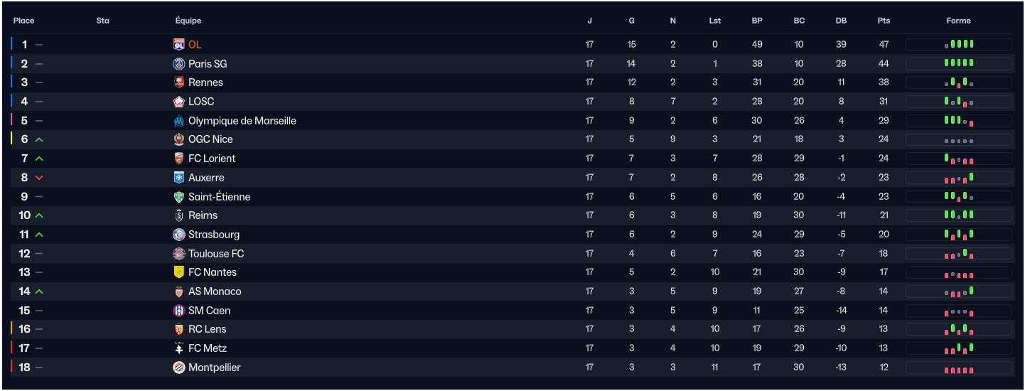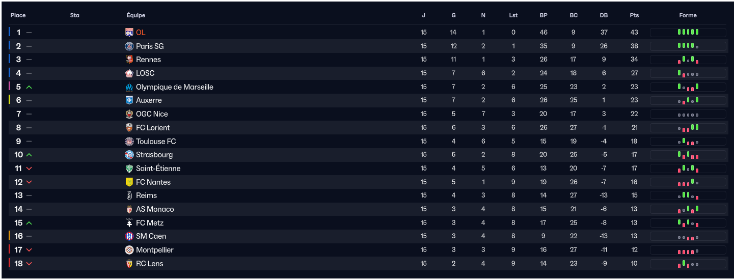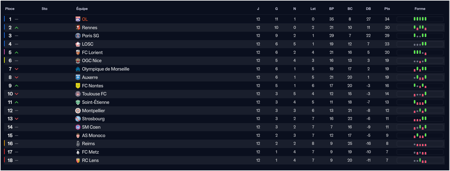 Match de mois de Novembre : Stuttgart (A), Caen (H), City (A), Lille (A), Rennes (H).
