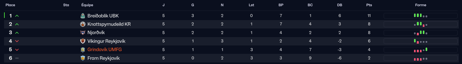 On peut voir que sur les 5 derniers matchs, Grindavik signe presque le pire bilan en terme de point.