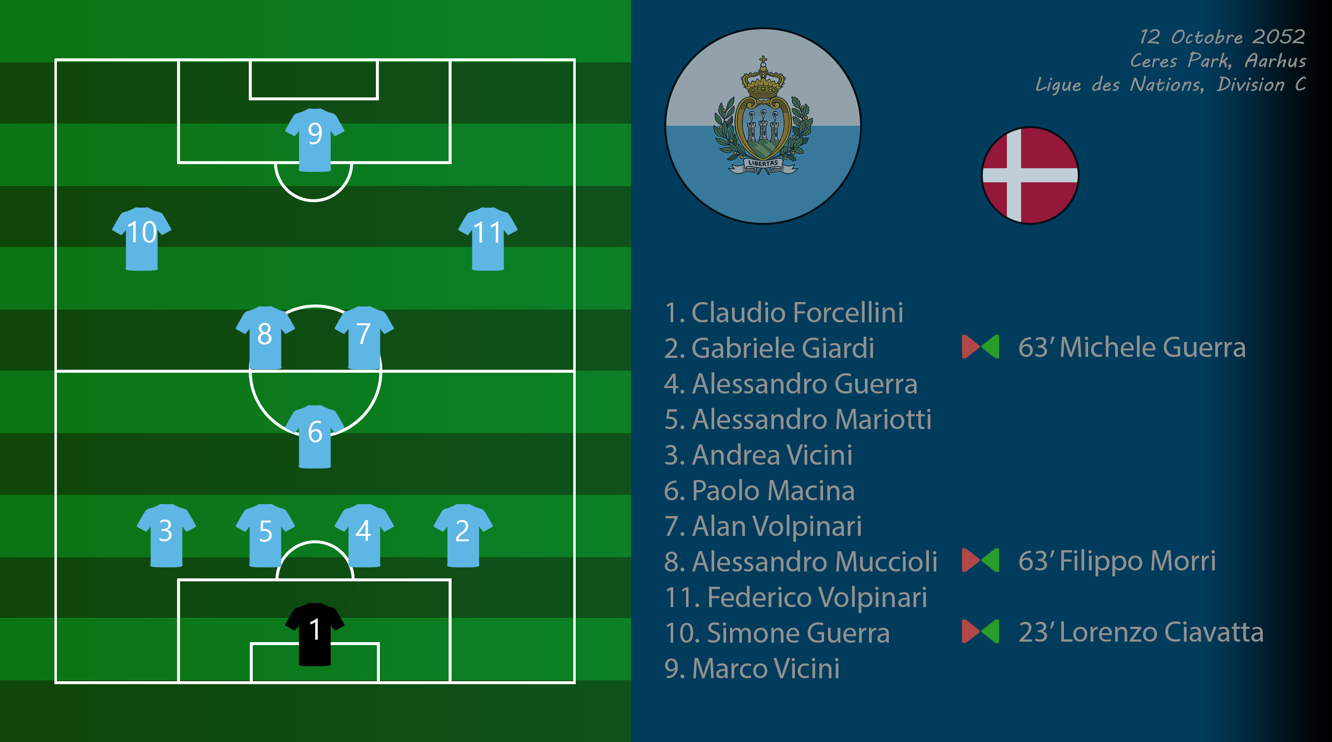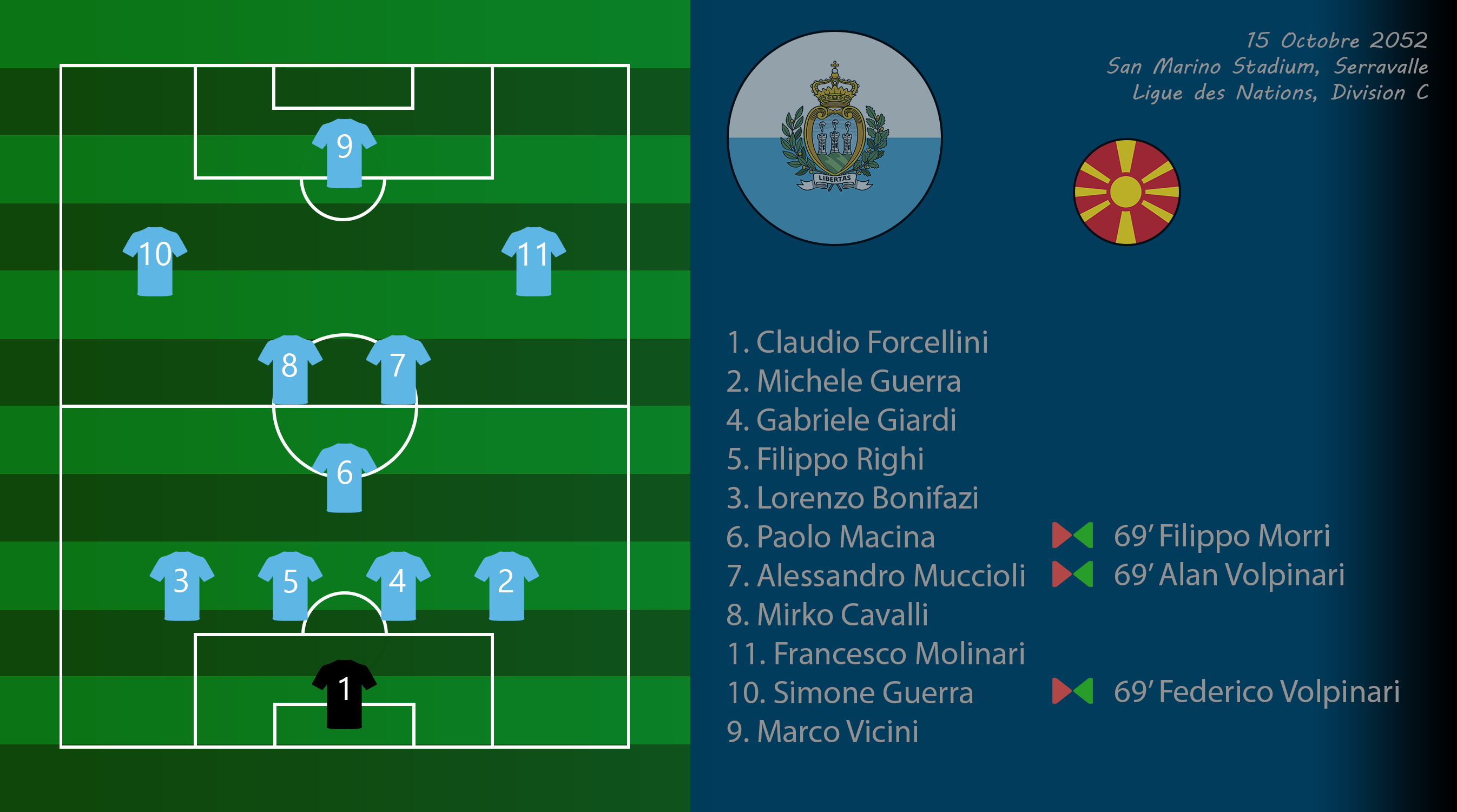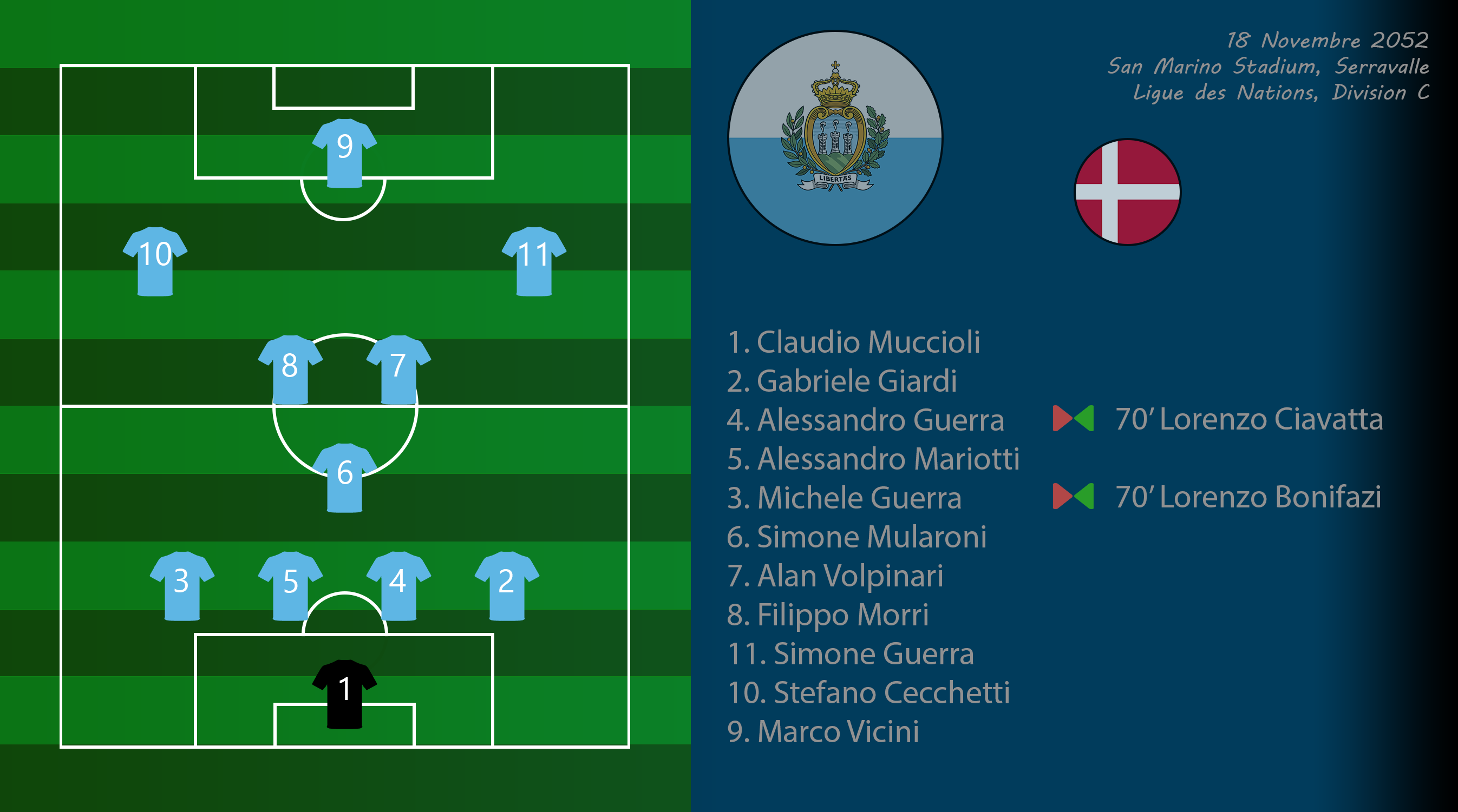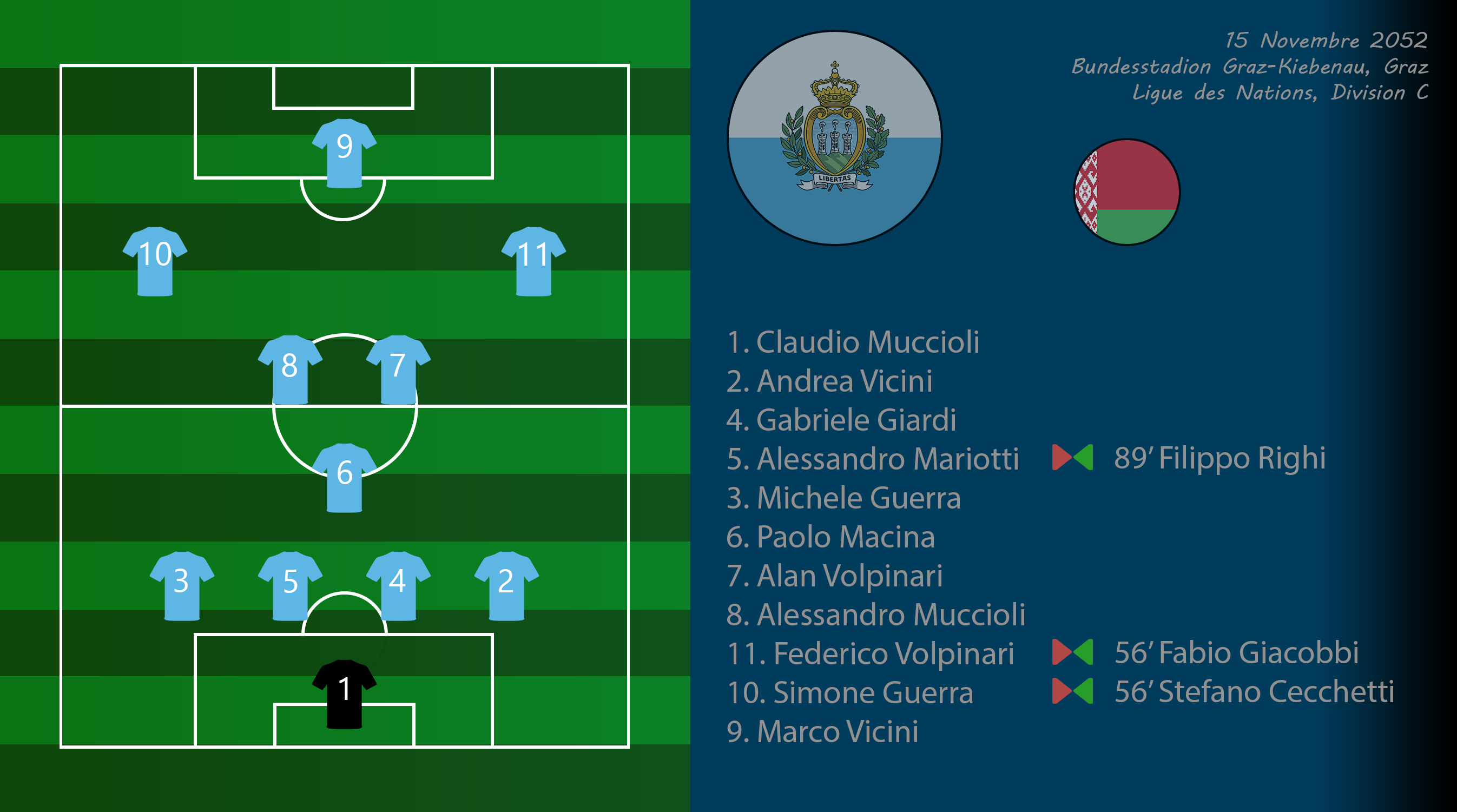 La 54e minute de jeu est devenue historique puisquâelle a permis Ă Alessandro Muccioli de devenir le plus jeune buteur en Ligue des Nations (16 ans et 111 jours).