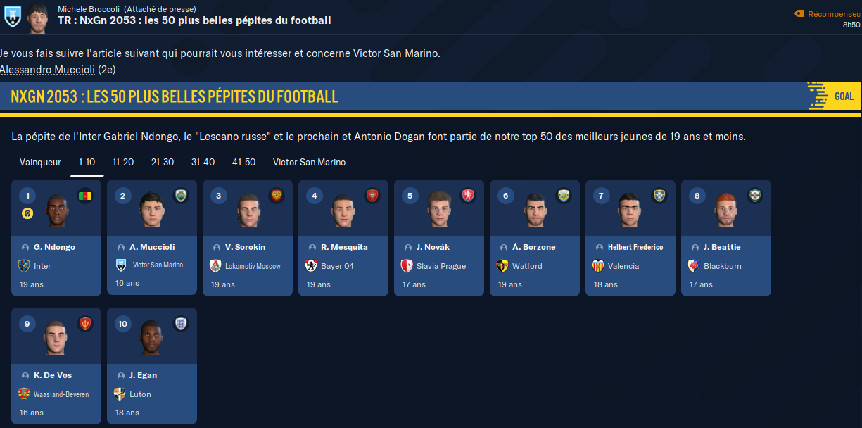 AprĂšs Federico Volpinari (3e) lâannĂ©e derniĂšre, Alessandro Muccioli a Ă©tĂ© classĂ© 2e du classement NxGn des pĂ©pites du foot mondial ! Ca dĂ©montre la belle marche en avant de notre micro Ă©tat.
