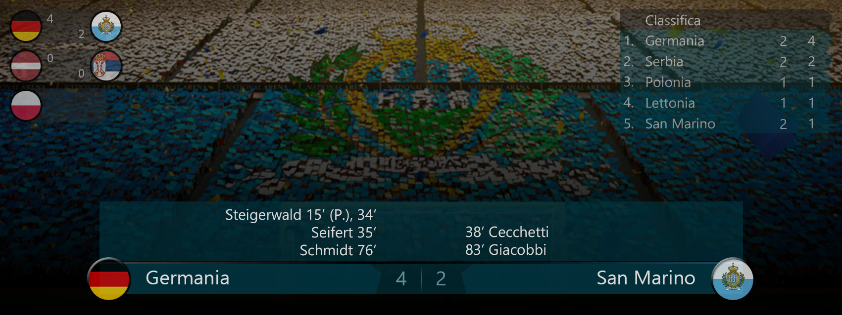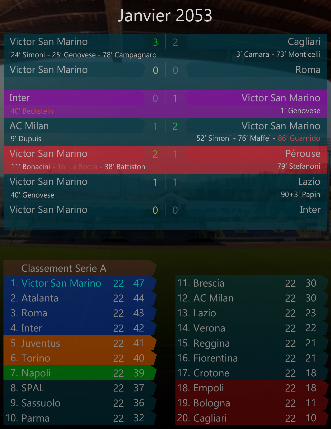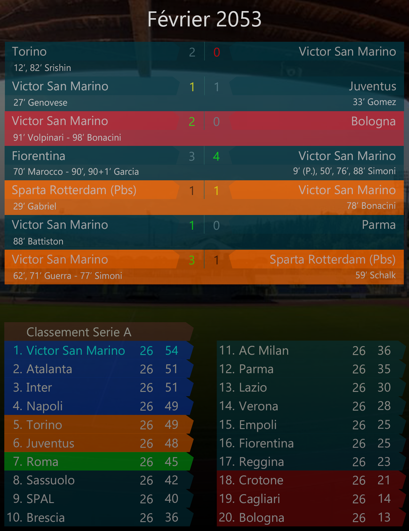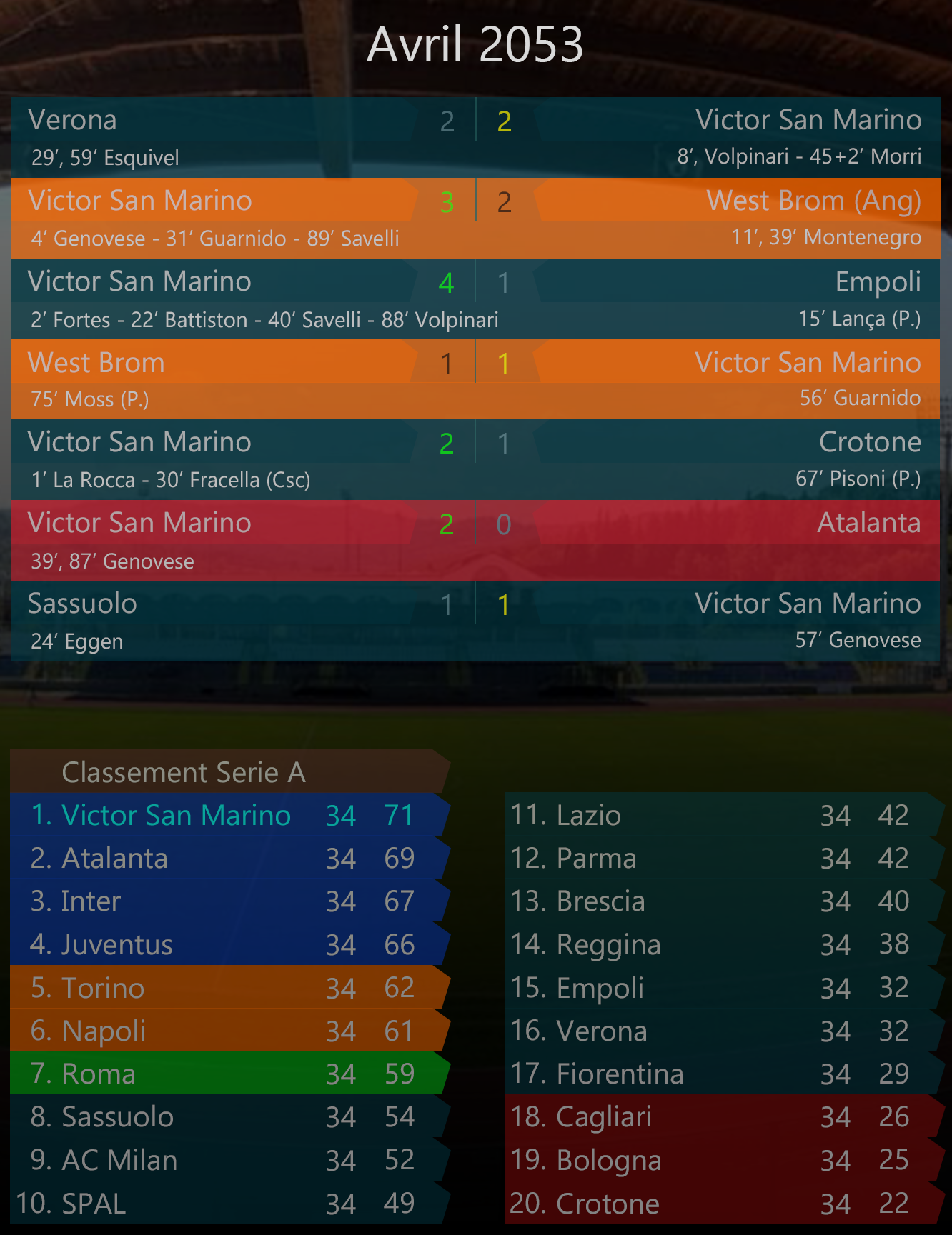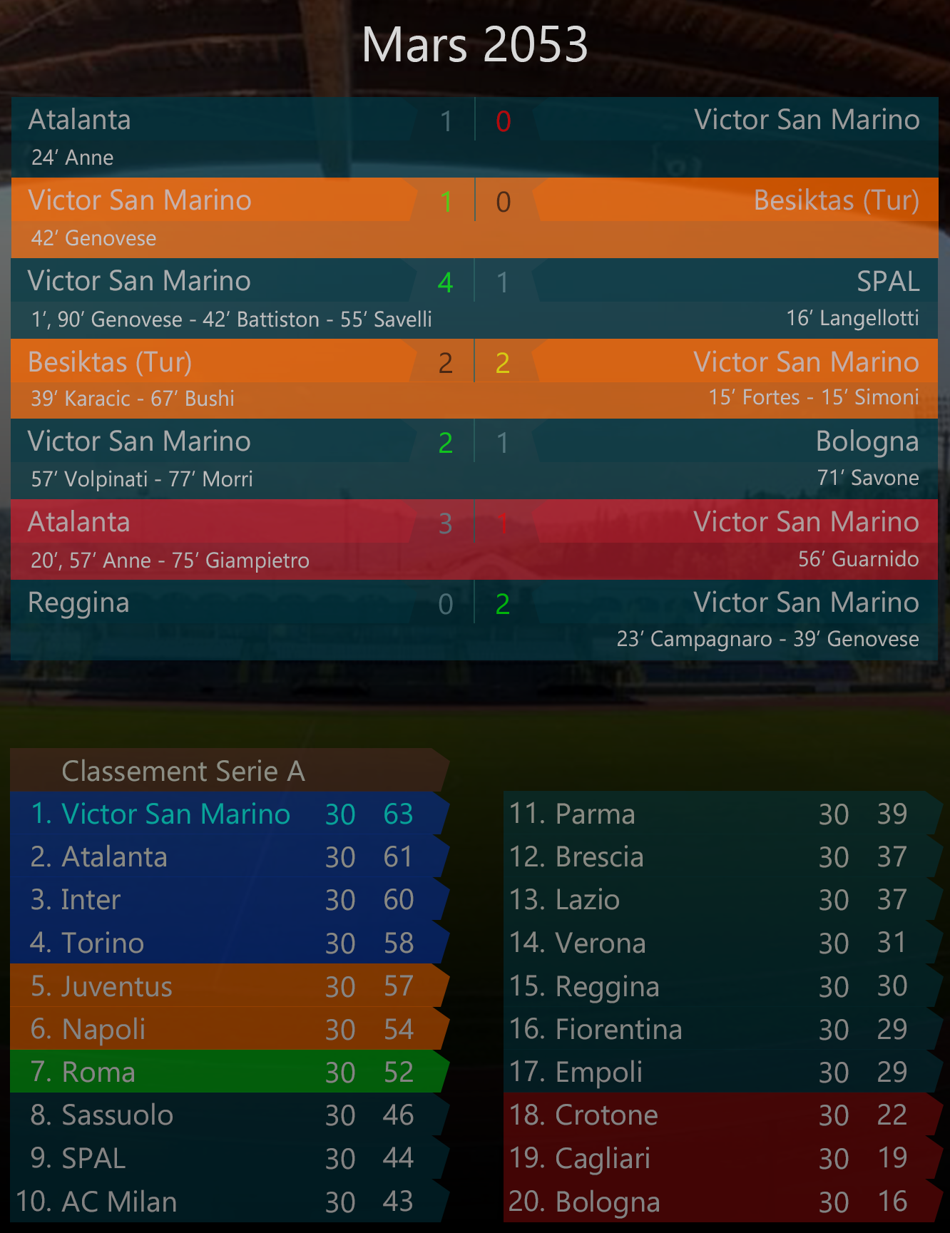 | Victor San Marino (1e - 71p) | Atalanta (2e - 69p) | Inter (3e - 67p) | Juentus (4e - 66p) | |