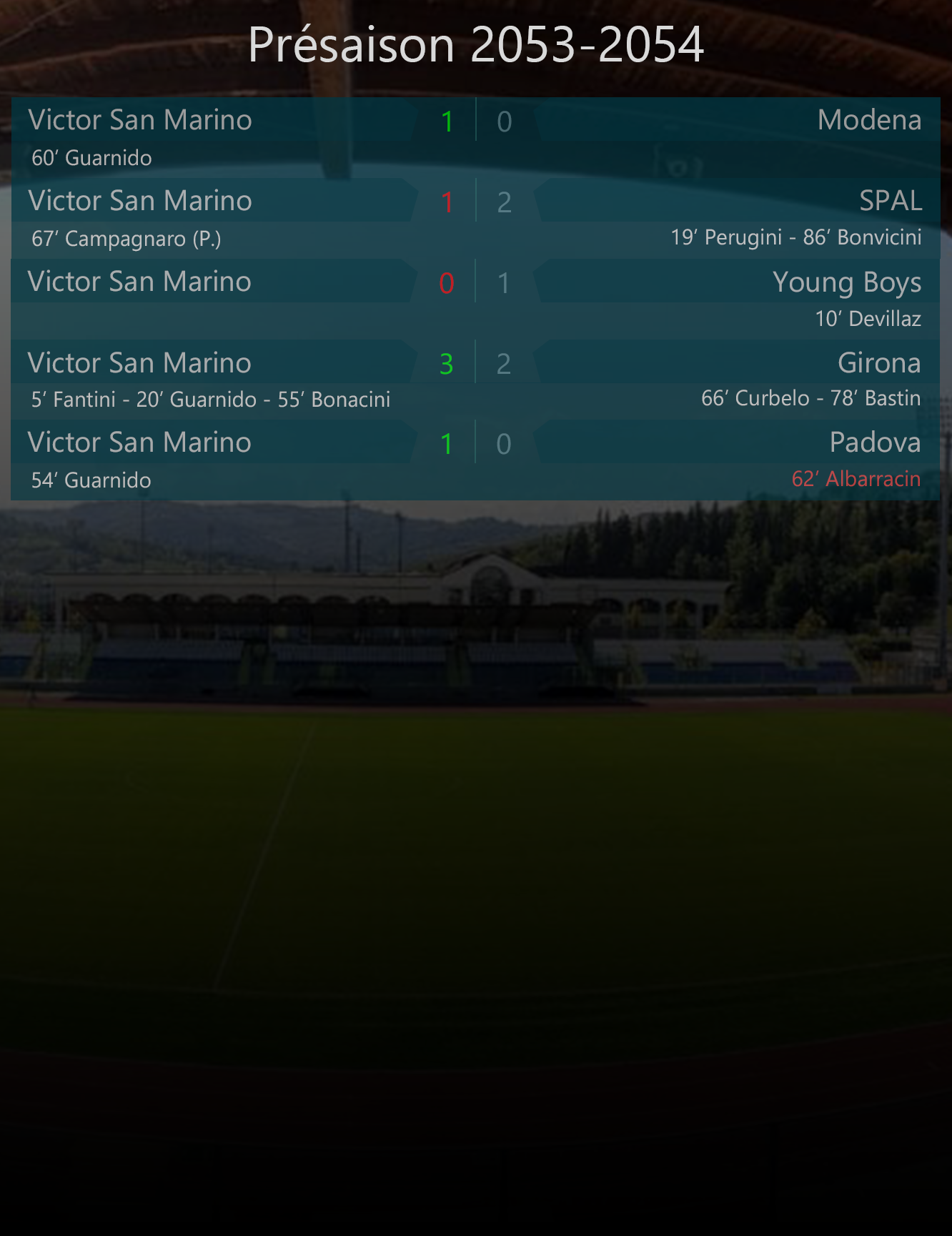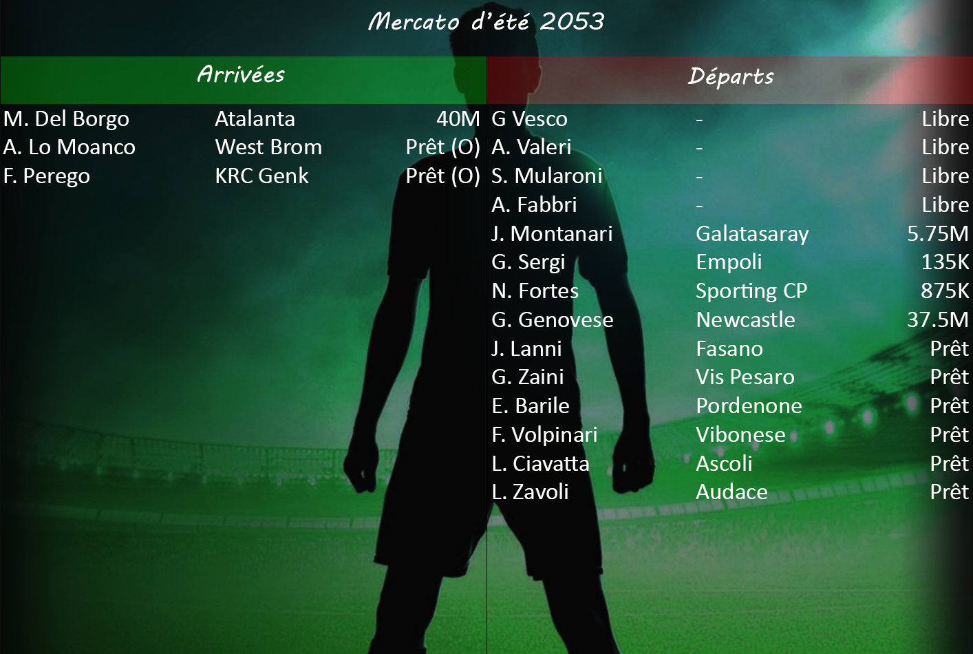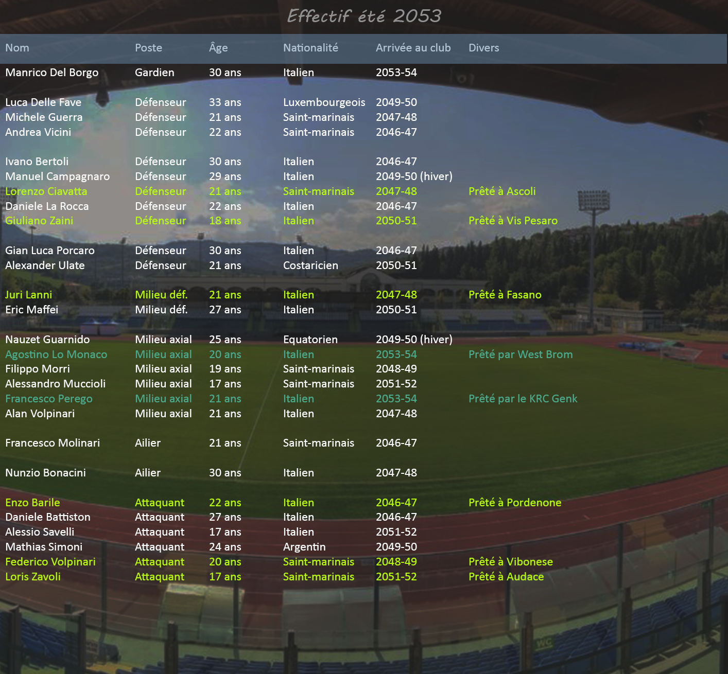 En fin de contrat, Gian Paolo Vesco, Antonino Valeri, Simone Mularoni et Andrea Fabbri quittent le club. Hormis Valeri, qui avait une assez bonne marge de progression, mais beaucoup de concurrence, nous nous débarrassons de seconds couteaux.