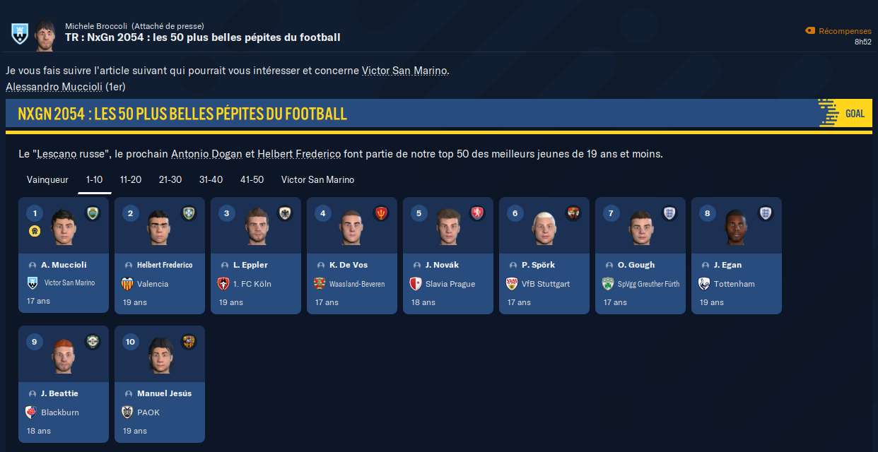 DĂ©jĂ prĂ©sent en deuxiĂšme position du classement NxGn de lâannĂ©e derniĂšre, Alessandro Muccioli est cette annĂ©e le premier de ce classement ! En espĂ©rant quâil continue Ă rĂ©pondre aux attentes dans les annĂ©es Ă venir