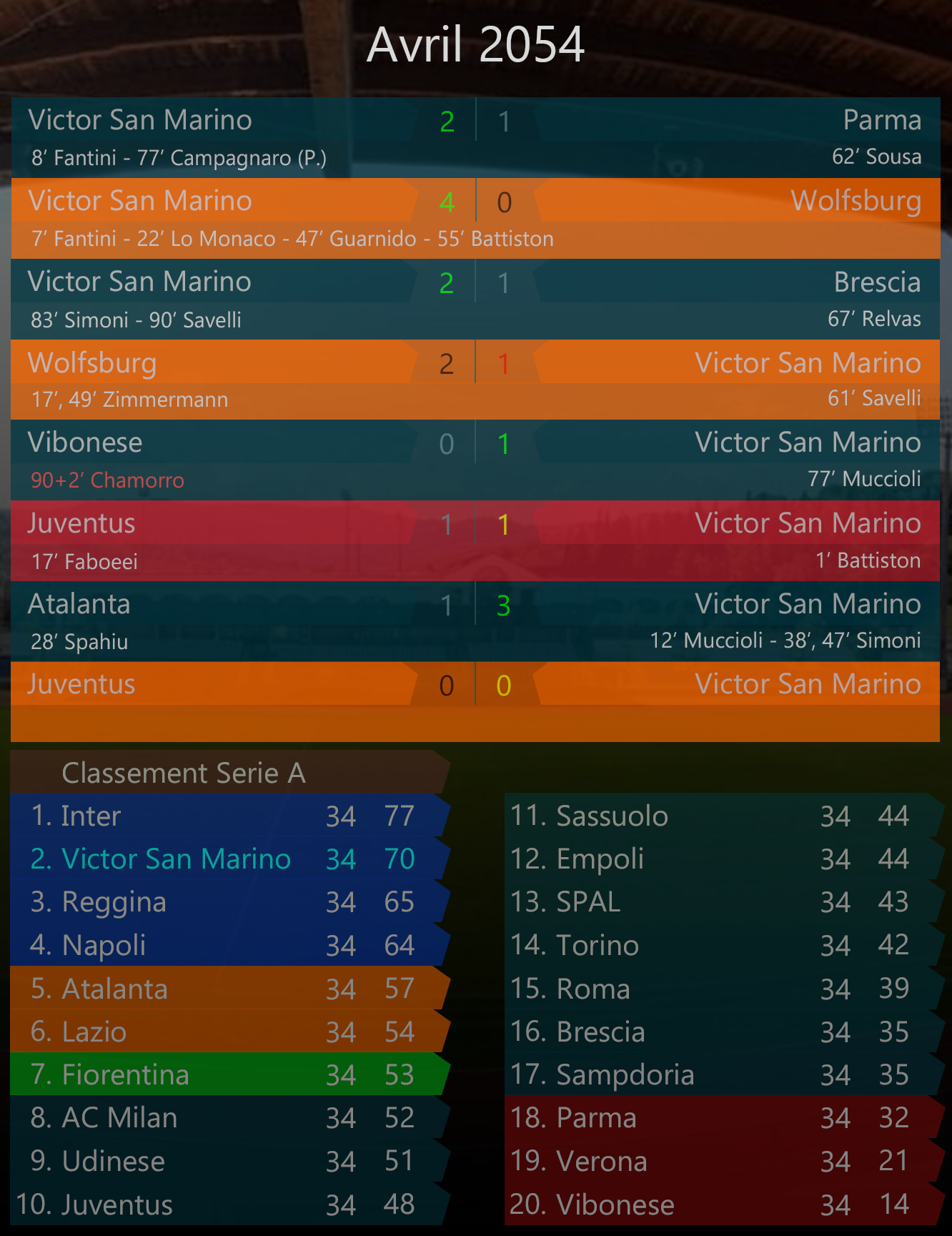 On prend 5 points dâavance sur la Reggina alors quâon a 7 points de retard sur lâInter. En 4 matchs, ça sera difficile Ă reprendre .. alors quâil y a un allĂ©chant Inter - Victor San Marino pour clĂŽturer la saison.